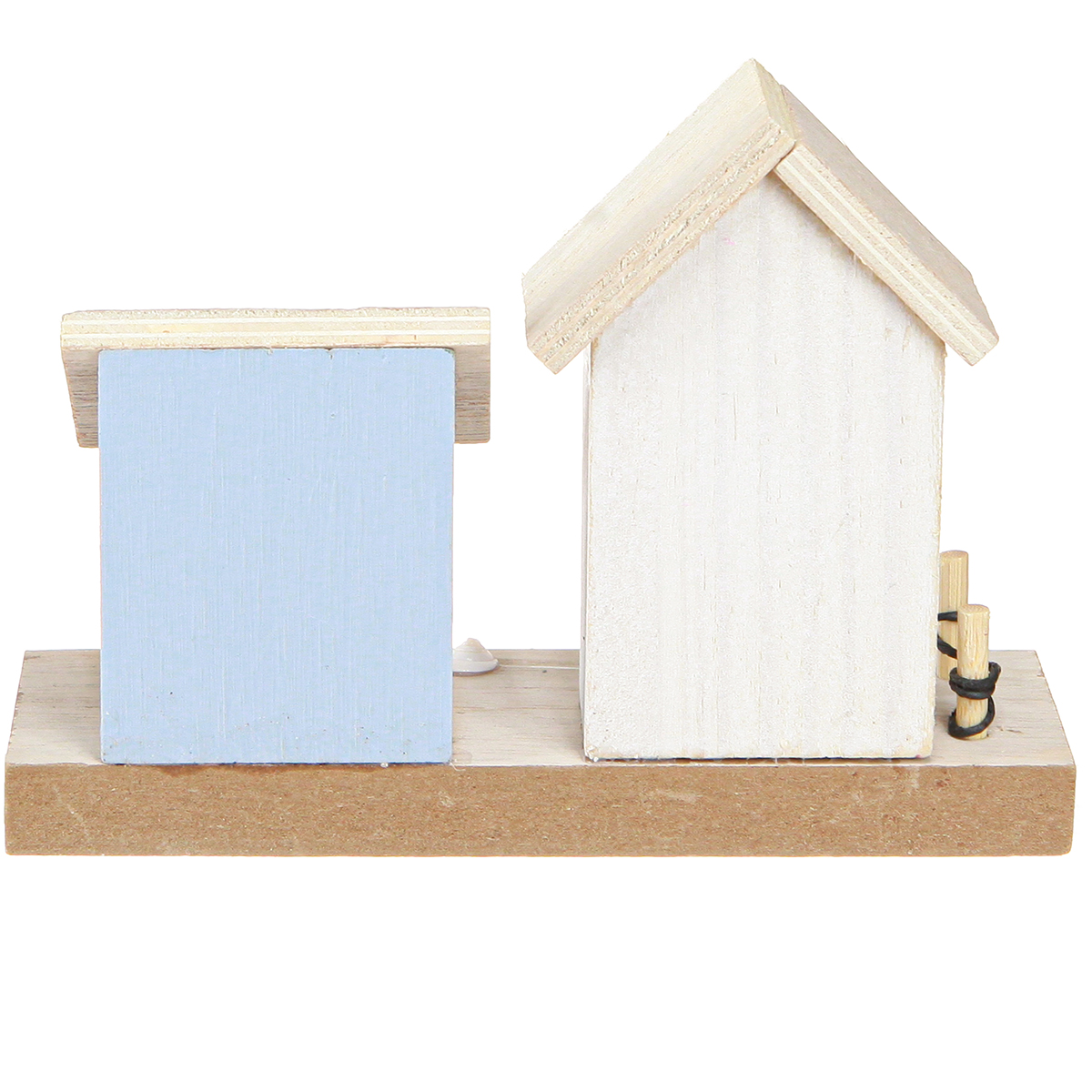 With our maritime decoration in a stylish beach house design, your home will become an oasis of well-being. This lovingly designed decorative beach house combination relies on natural materials and authentic elements that create an unmistakable sea flair. The decorative beach houses in blue, white and natural are the ideal eye-catcher for your home, be it as a maritime decoration for the display cabinet, the bathroom or as a table decoration at summer events. Two shapely houses sit enthroned on a base made of real beach essence: Fine beach sand adorns the sanded edge. The high construction of the white wooden house with its detailed black painted windows is perfectly complemented by the lovingly painted smaller blue house. Both buildings are accompanied by real shells and an artfully wrapped mini railing made of thin paper wire. Each arrangement is unique, which is guaranteed by the selection of the shells and the individually wrapped mini railing. Harmoniously complemented by the natural wooden structures on the roofs, this beach house decoration gives every room a maritime flair.