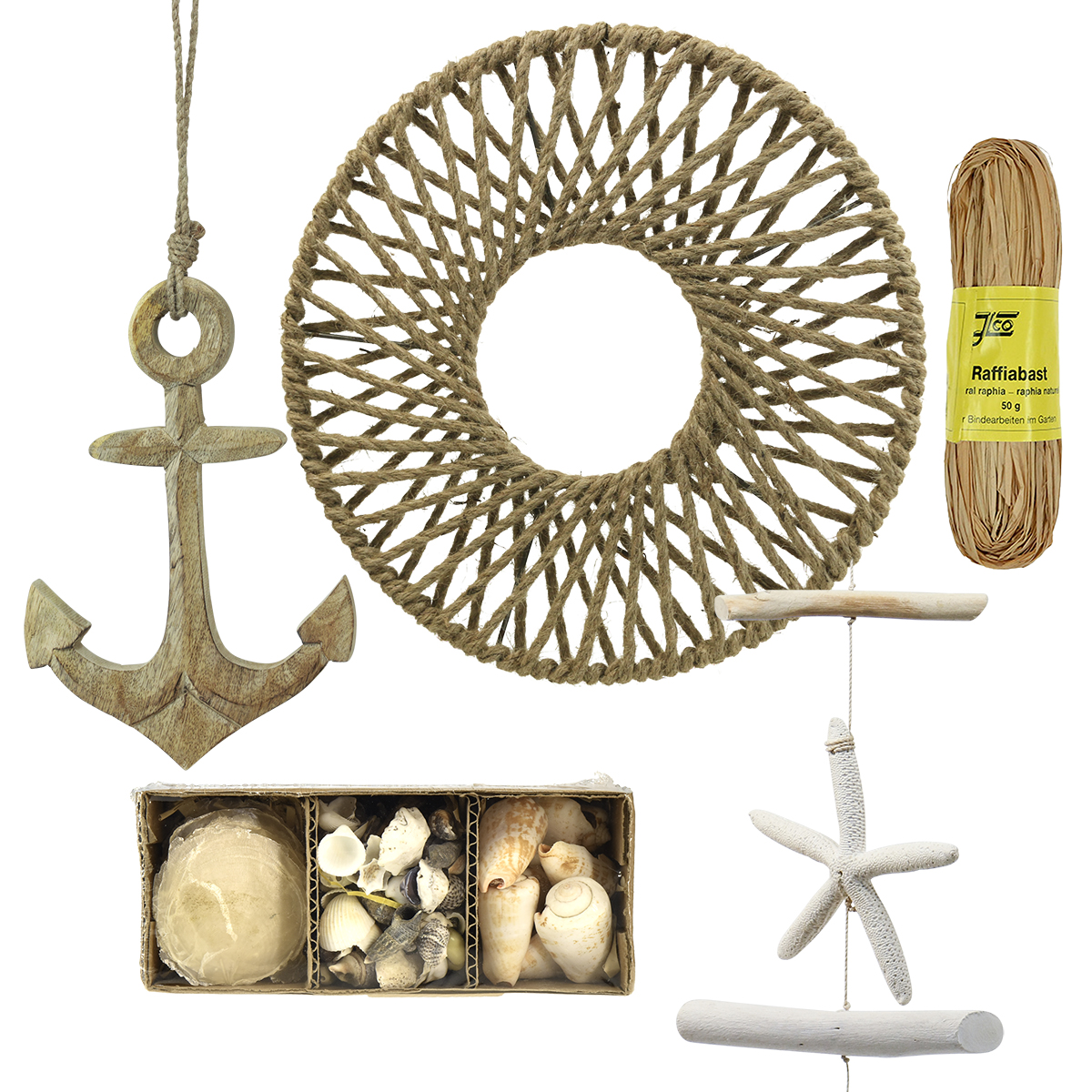Anchor, starfish, wooden decorations and shells - the DIY box has everything. The decorative ring with jute cord looks a bit like a fishing net in the maritime decoration, the natural fiber is reminiscent of ropes. A large anchor made of untreated wood serves as a focal point. Real driftwood and white shells as decoration bring authenticity.