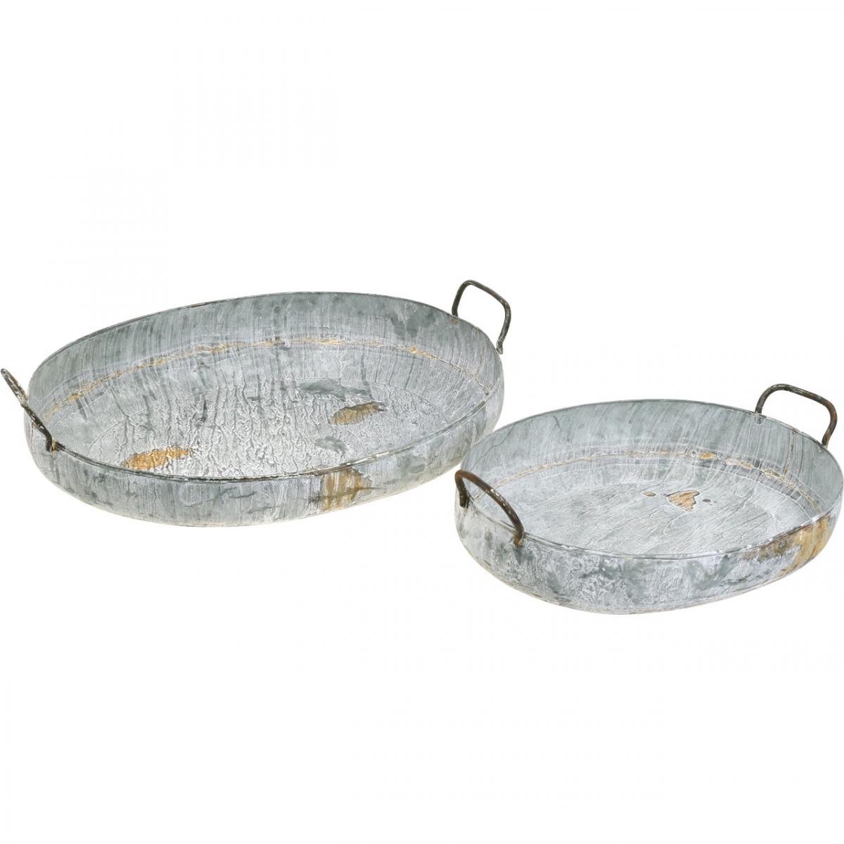 Metal bowl with handles, planter, decorative tray antique look white washed L51/40.5cm set of 2