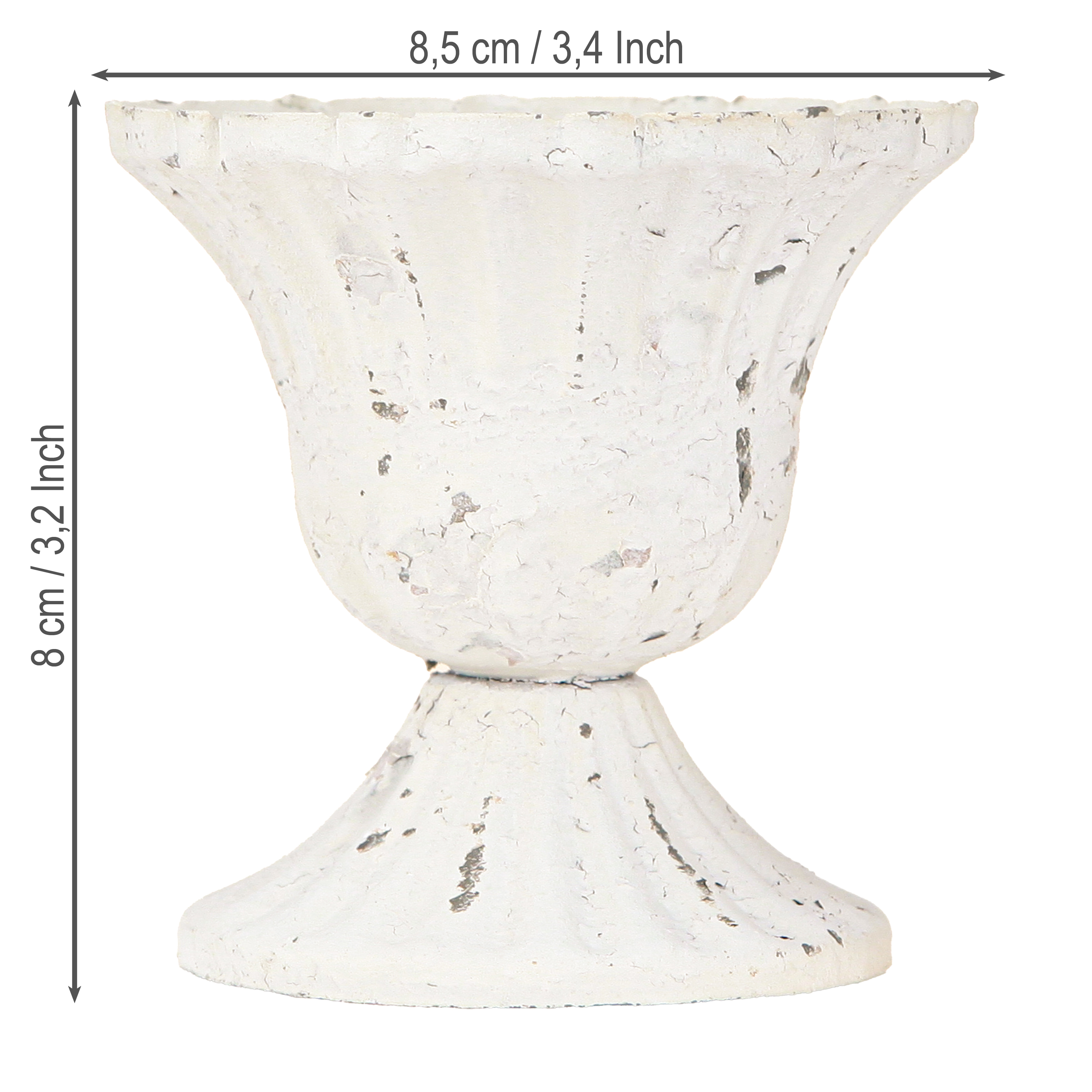 The small shabby chic goblet has an approximate outer diameter of about 8.5 centimeters. The diameter of the base is about 7 centimeters. Overall, the metal goblet is about 8 centimeters high.
