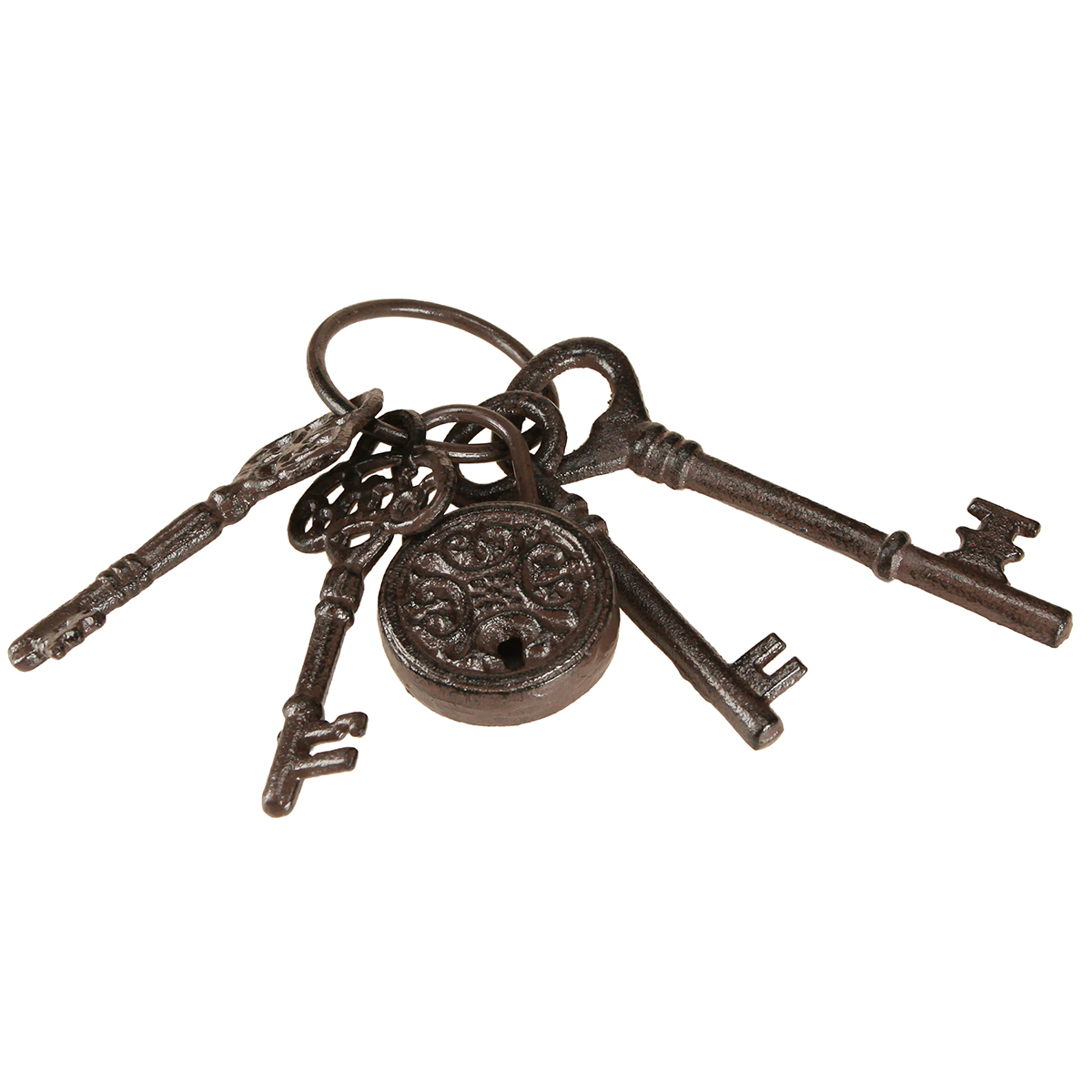 Refine your vintage decoration with this original bunch of keys on a metal ring in brown! The individual keys and the ring in this hanging or table decoration are made of cast iron. The individual elements are painted in a dark brown, which also creates the non-slip patina on the surface. This makes the decorative keys and the lock appear artificially aged, which is further underlined by the vintage design of the individual beards.With the key ring, you can easily hang the metal keys on a hook or on a sturdy ribbon and create an original wall decoration. Of course, you can also lay the decorative keys down and use them as part of a traditional country-style table decoration.