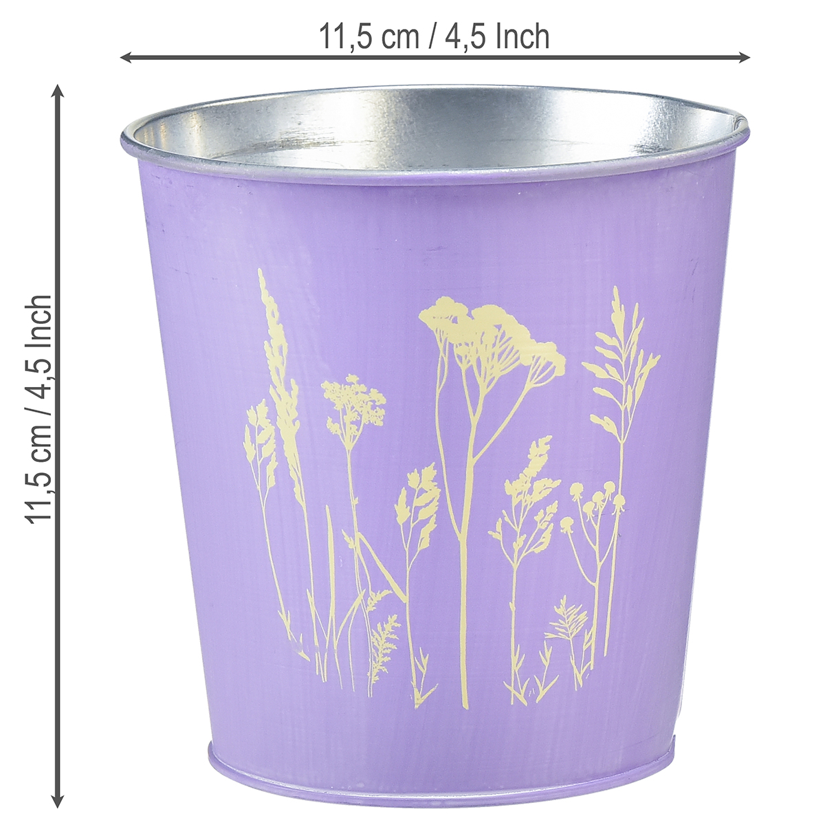 This metal flower pot is decorated with a flower meadow. Meadow flowers appear on the purple planter with a golden shimmer.