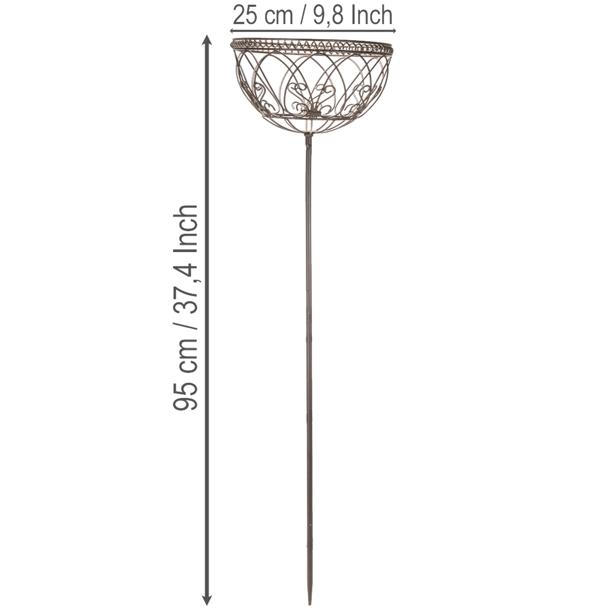 Add a touch of romance to your garden, patio, or balcony with this decorative vintage-style metal basket. Made of sturdy, brown-painted metal, this high-quality garden basket is perfect for sheltered outdoor areas. Measuring 95 centimeters in height and 25 centimeters in diameter, it exudes elegance and is sure to catch the eye. Whether used as a decorative bowl in the garden, a stylish vintage-style trellis, or a plant pot holder for your patio, this metal basket creates a charming atmosphere and impresses with its versatility.