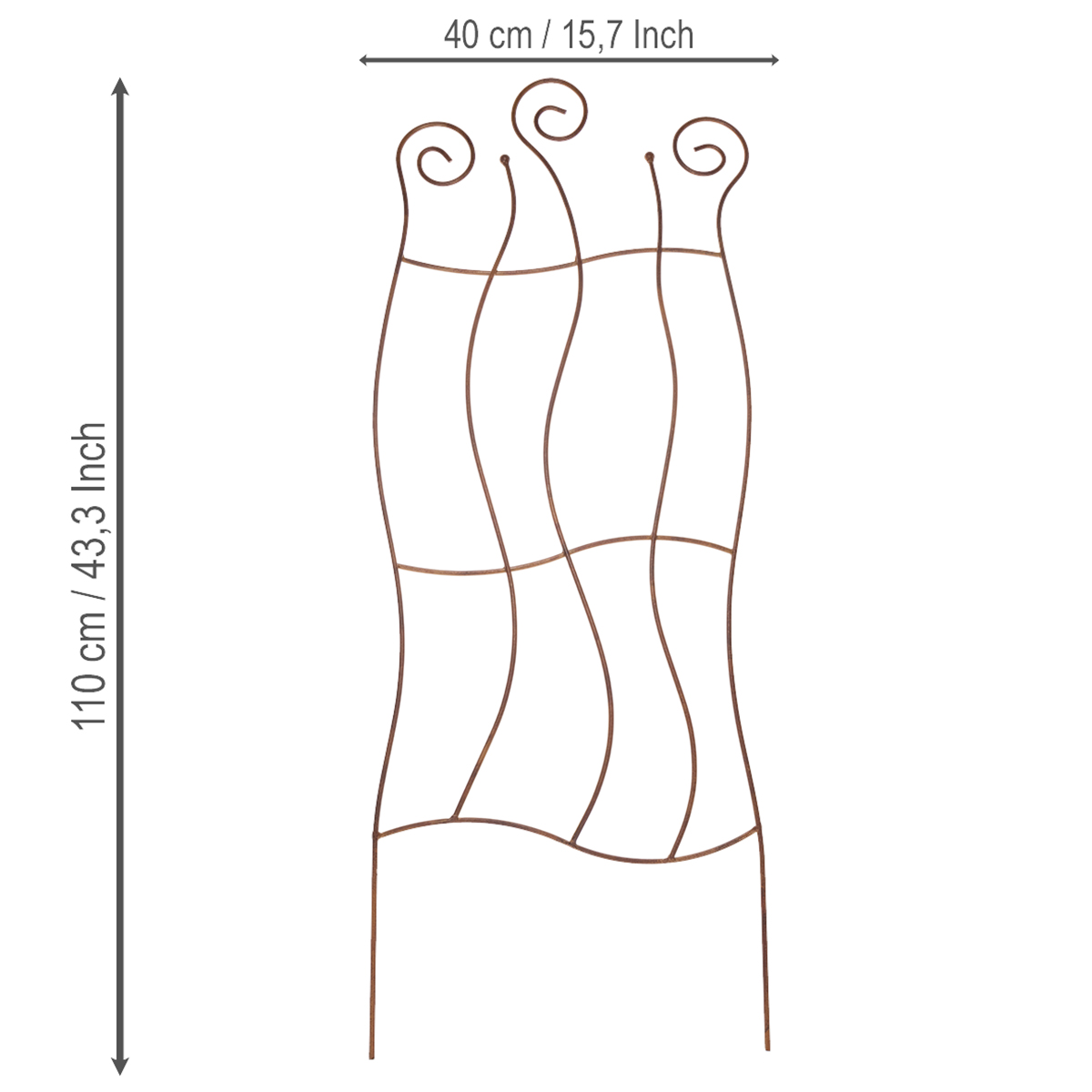 Transform your garden into a blooming paradise with this metal trellis! This artfully crafted trellis with its elegant, curved design is more than just practical support for your climbing plants – it's a decorative highlight that adds a touch of nostalgia to your garden landscape. Made from high-quality metal with an attractive, weathered rust finish, it perfectly combines functionality and style. Whether for wild roses, ivy, or clematis, this trellis provides your plants with the support they need for magnificent growth. At 110 centimeters tall, it's both sturdy and space-saving, making it ideal for sheltered outdoor areas.