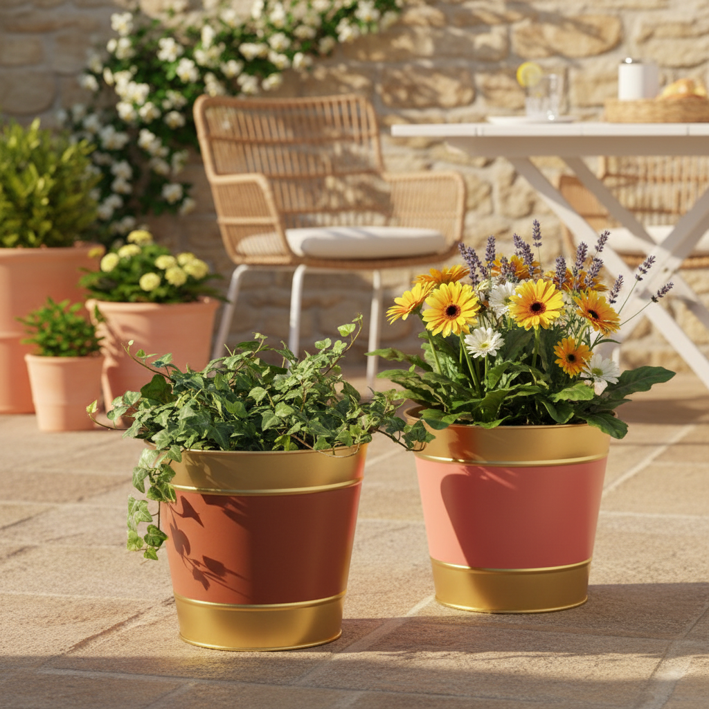 This set of four plant pots with a gold rim and the great color scheme will inspire you. The metal flower pots come in the trendy colors of brown, beige, pink and peach.