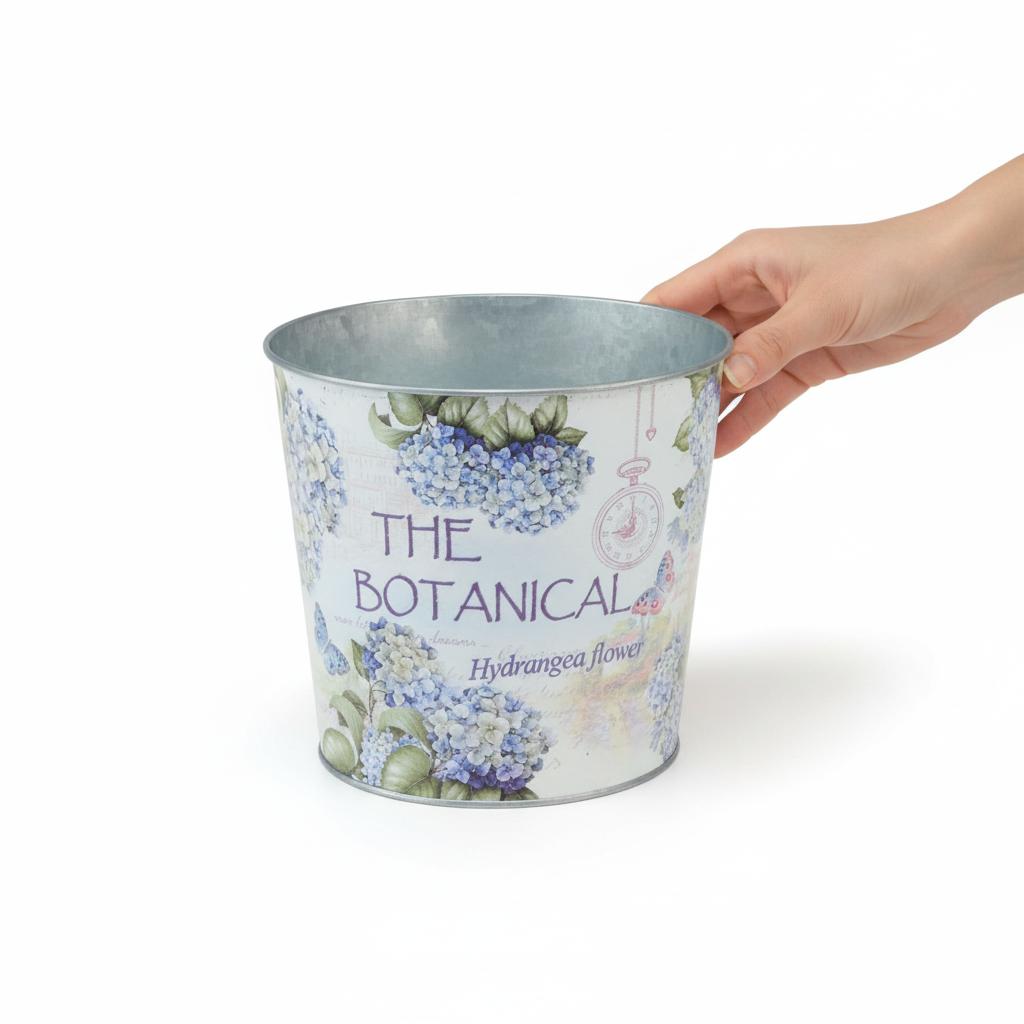 This metal planter is full of summer romance! The hydrangeas on the flower pot surround plants and flowers with the magic of a blooming garden.