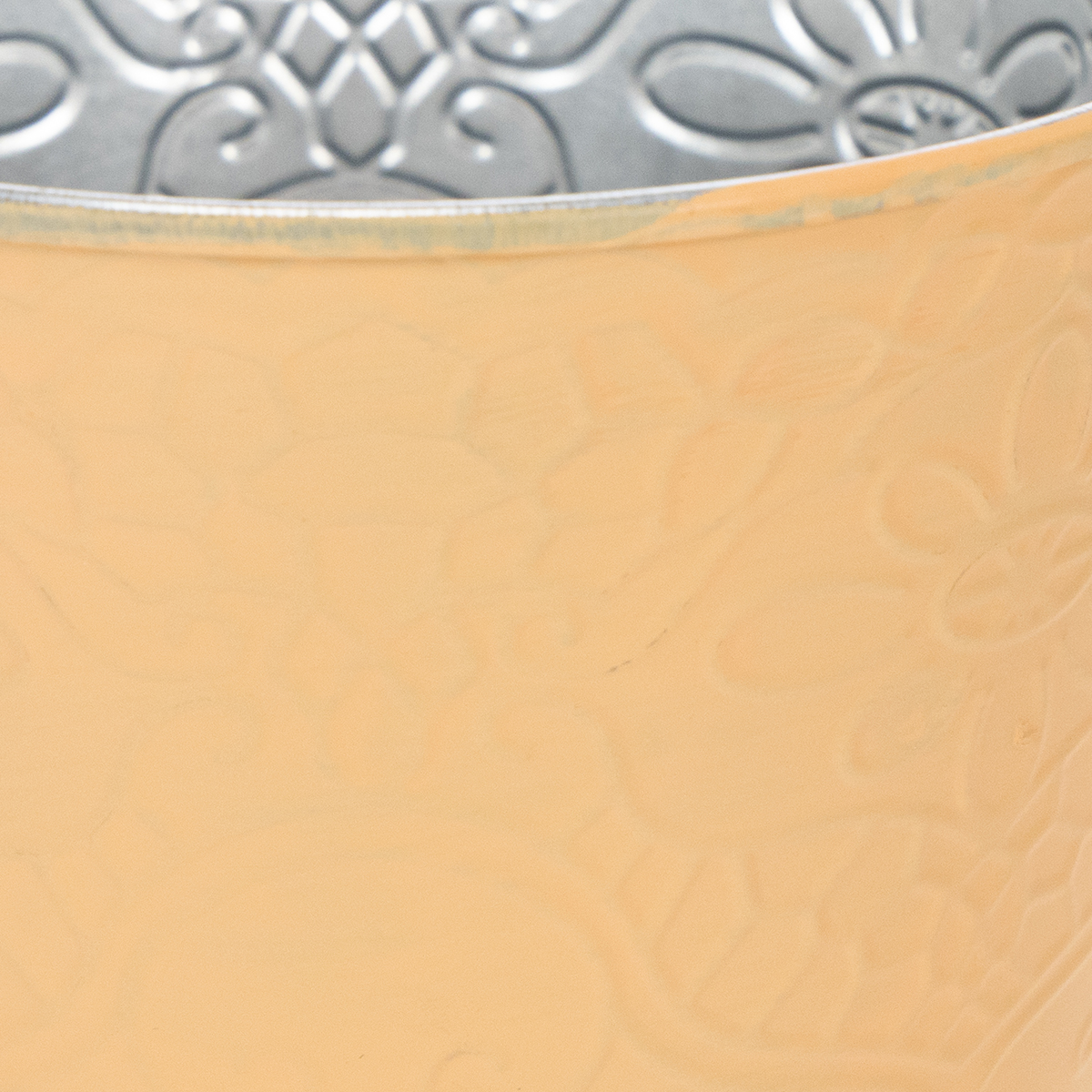 The ornate retro motif with flowers comes out wonderfully three-dimensional thanks to the embossing on the metal pot. This effect is further enhanced by the slightly uneven application of paint on the flower pot: Individual brushstrokes of the pastel color can be seen on the metal decoration.