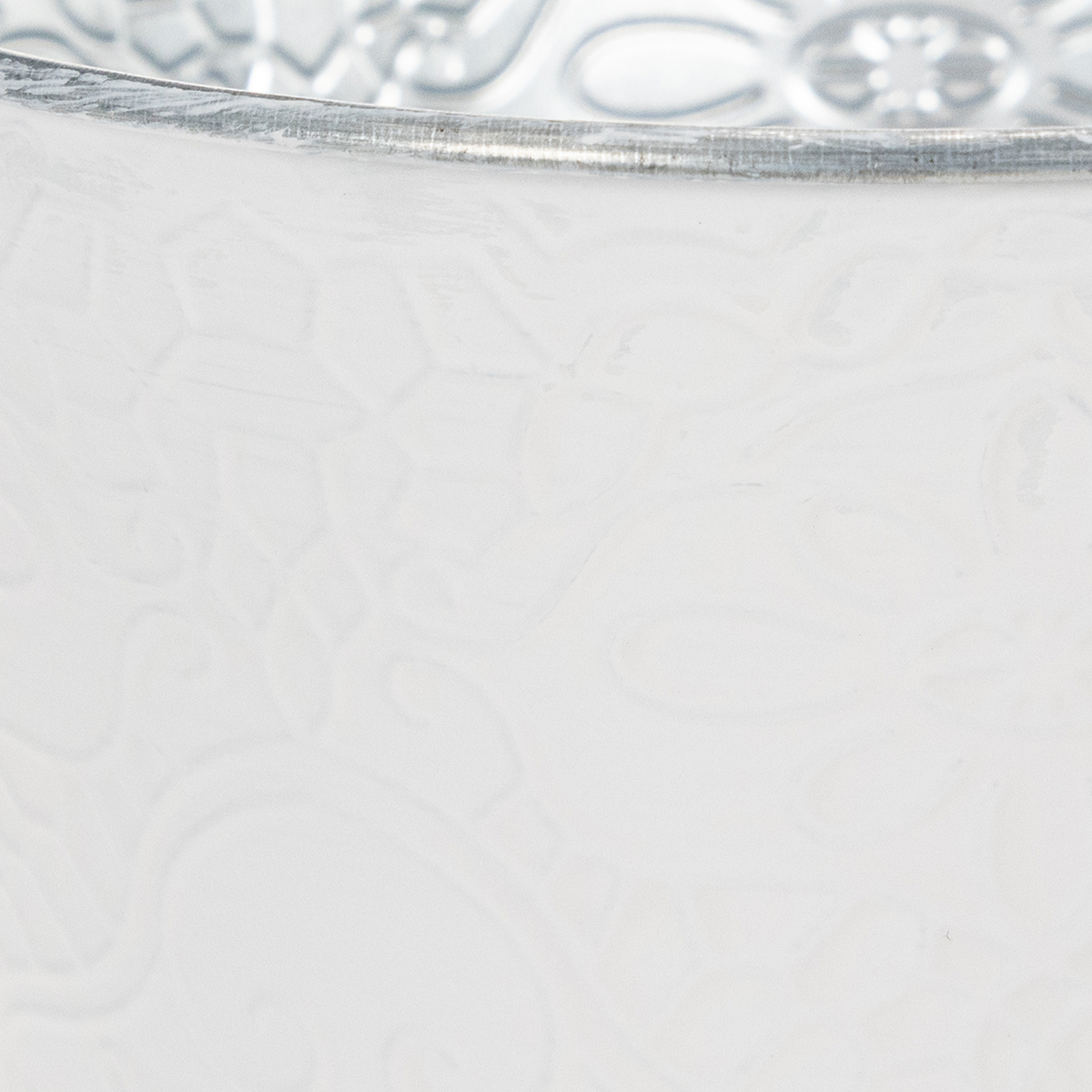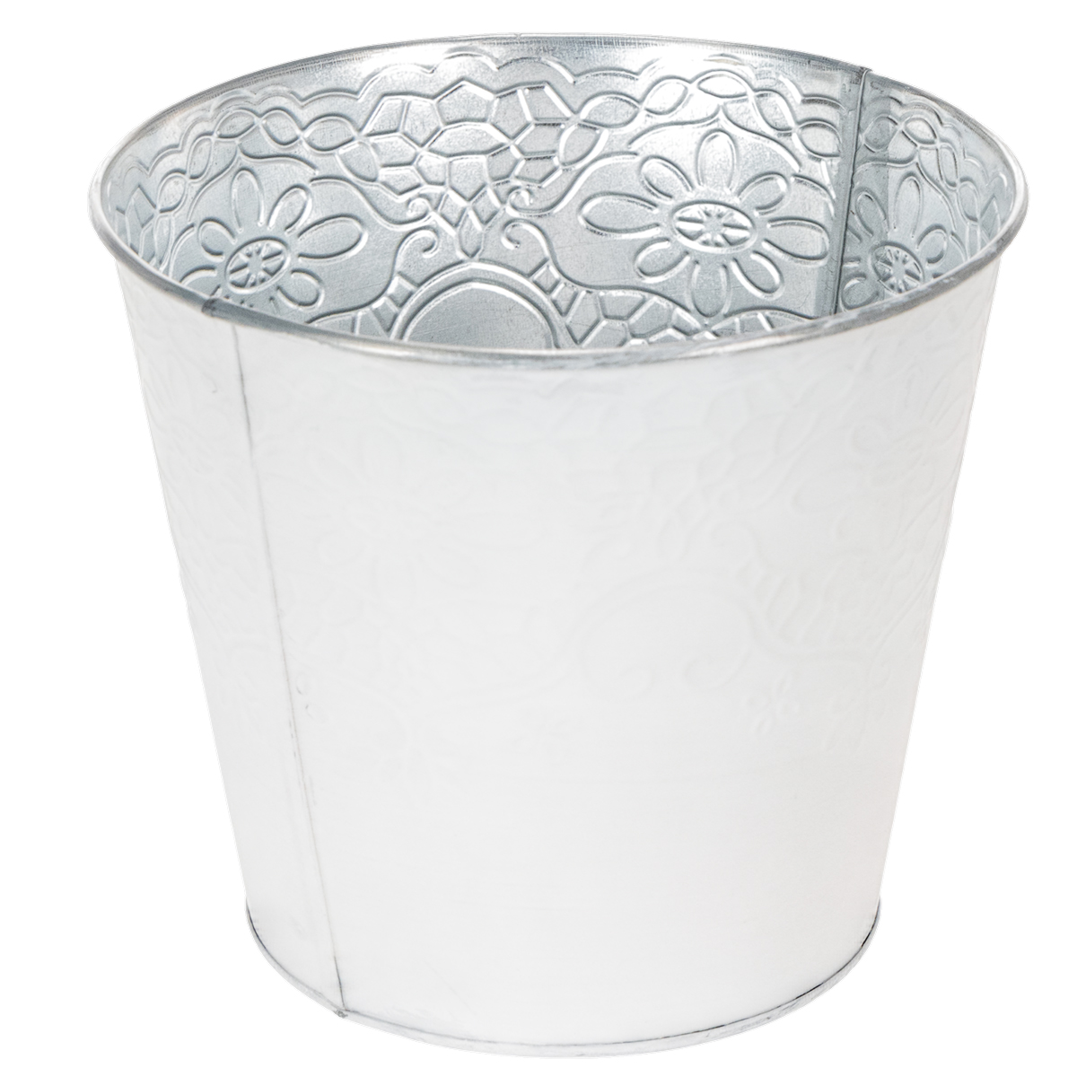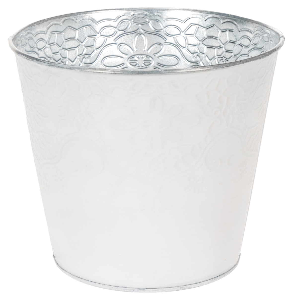 A detailed pattern of tendrils and flowers adorns the metal planter as an embossing. In combination with the pastel white painting on the outside, this creates a wonderfully nostalgic cachepot for spring!