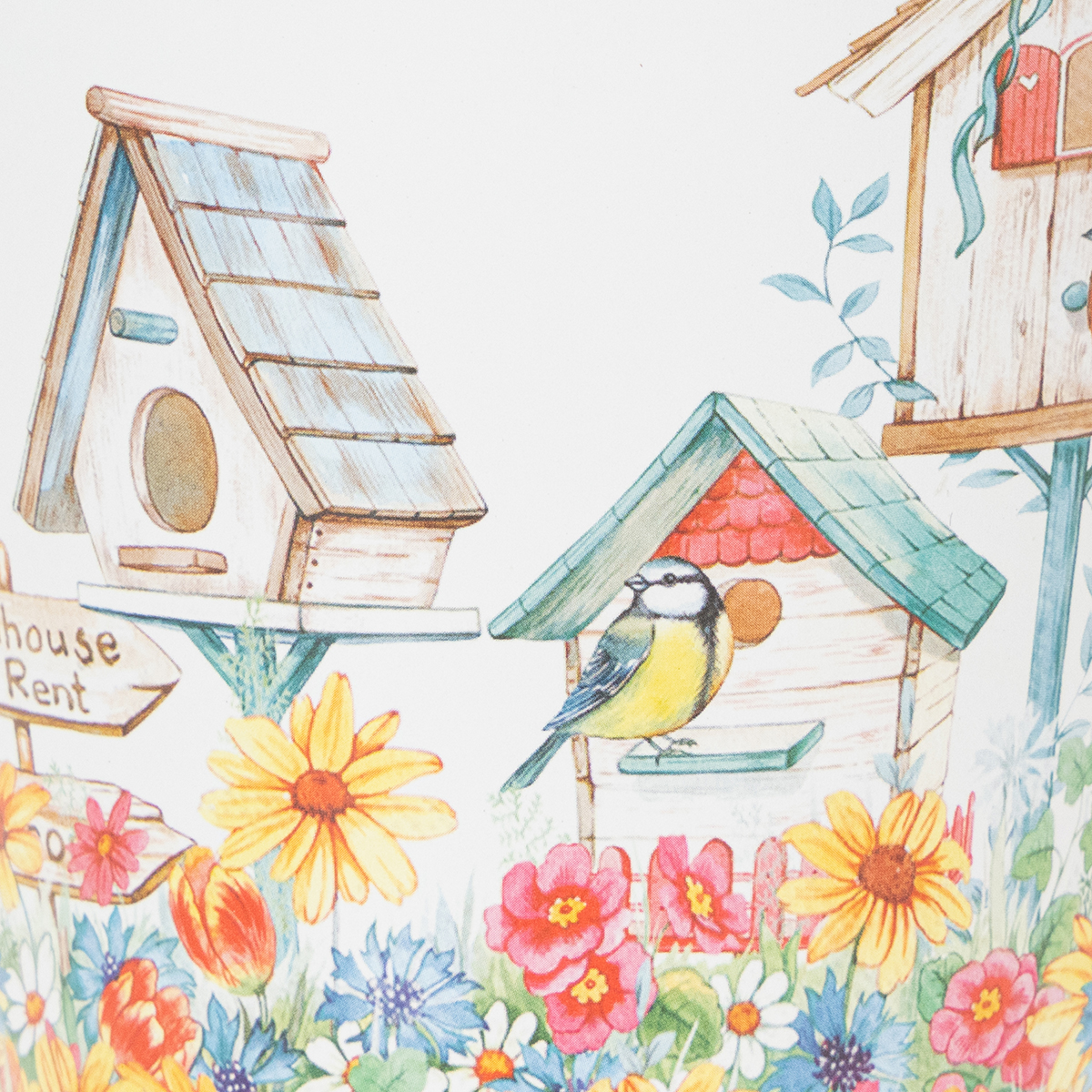 This tin bucket is covered with a printed film, showing a colorful sea of flowers with three different nesting boxes - a few birds can also be seen.