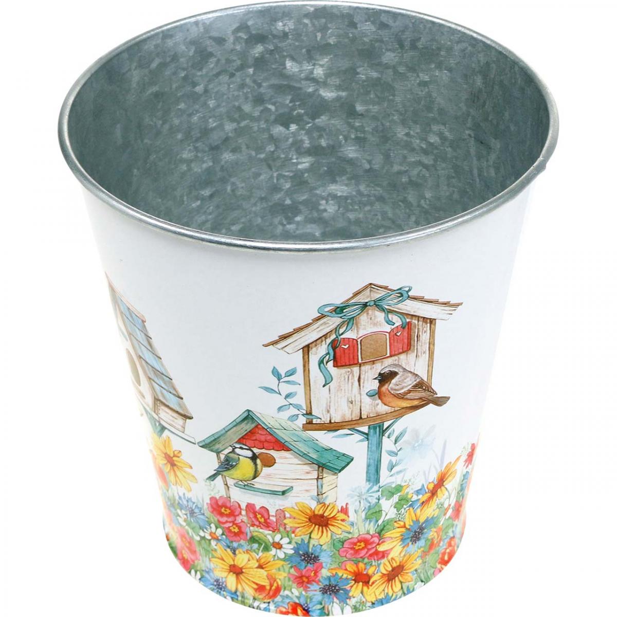 Metal pot with motif, planter with birdhouses, tin bucket H13cm Ø11.5cm