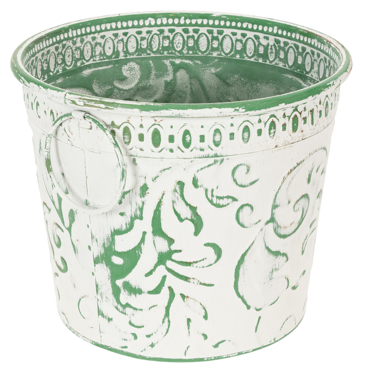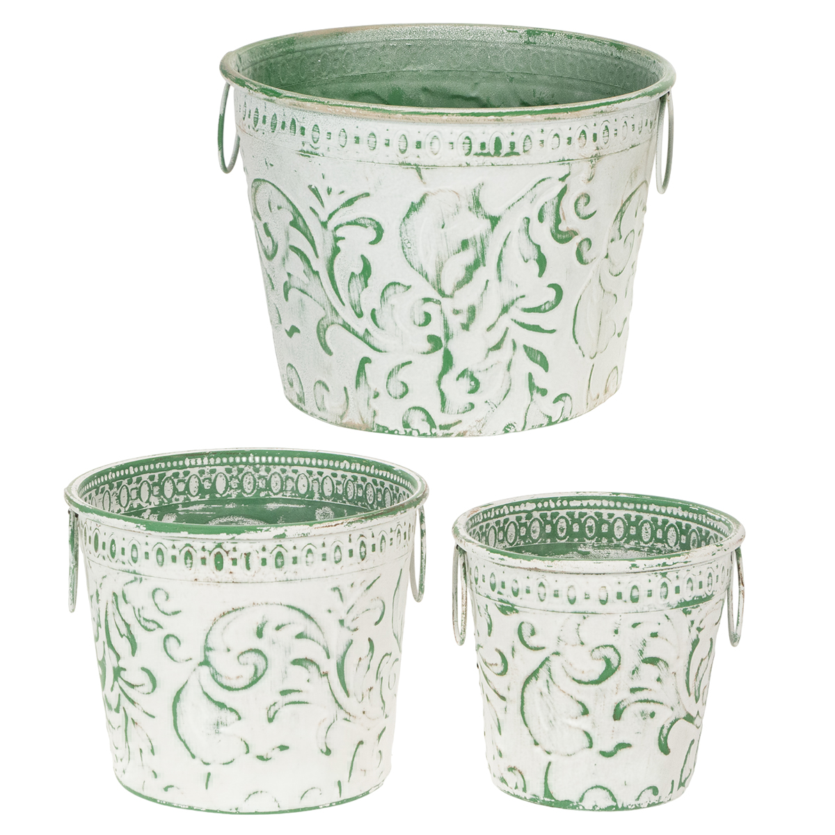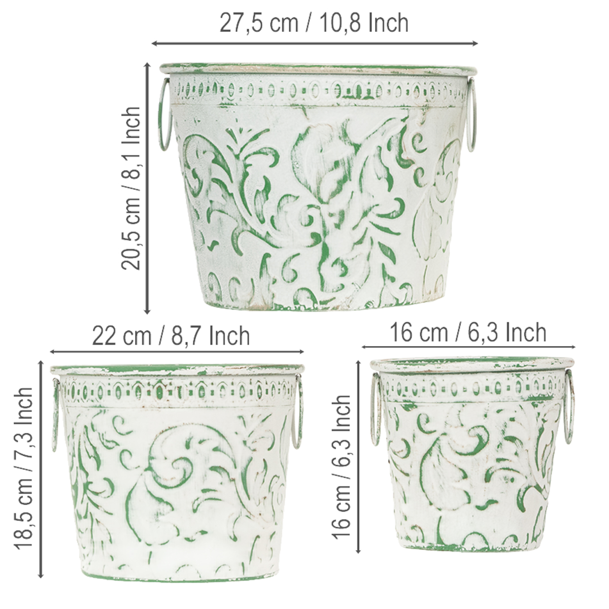 Metal pots with handles, planters with embossing, white, green, shabby chic, H20.5/18.5/16cm, Ø25.5/20.5/15.5cm, set of 3