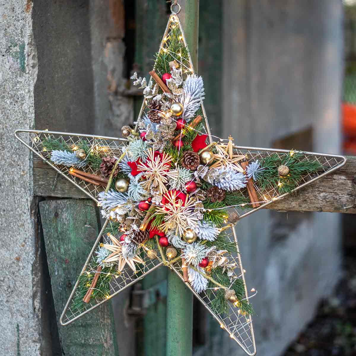 You can use this large metal star to shape your own decorative star. The meshes of the grid star are about 1.2 centimeters in size. This allows artificial plants, dried flowers or a wide variety of ribbons to be pulled and attached.