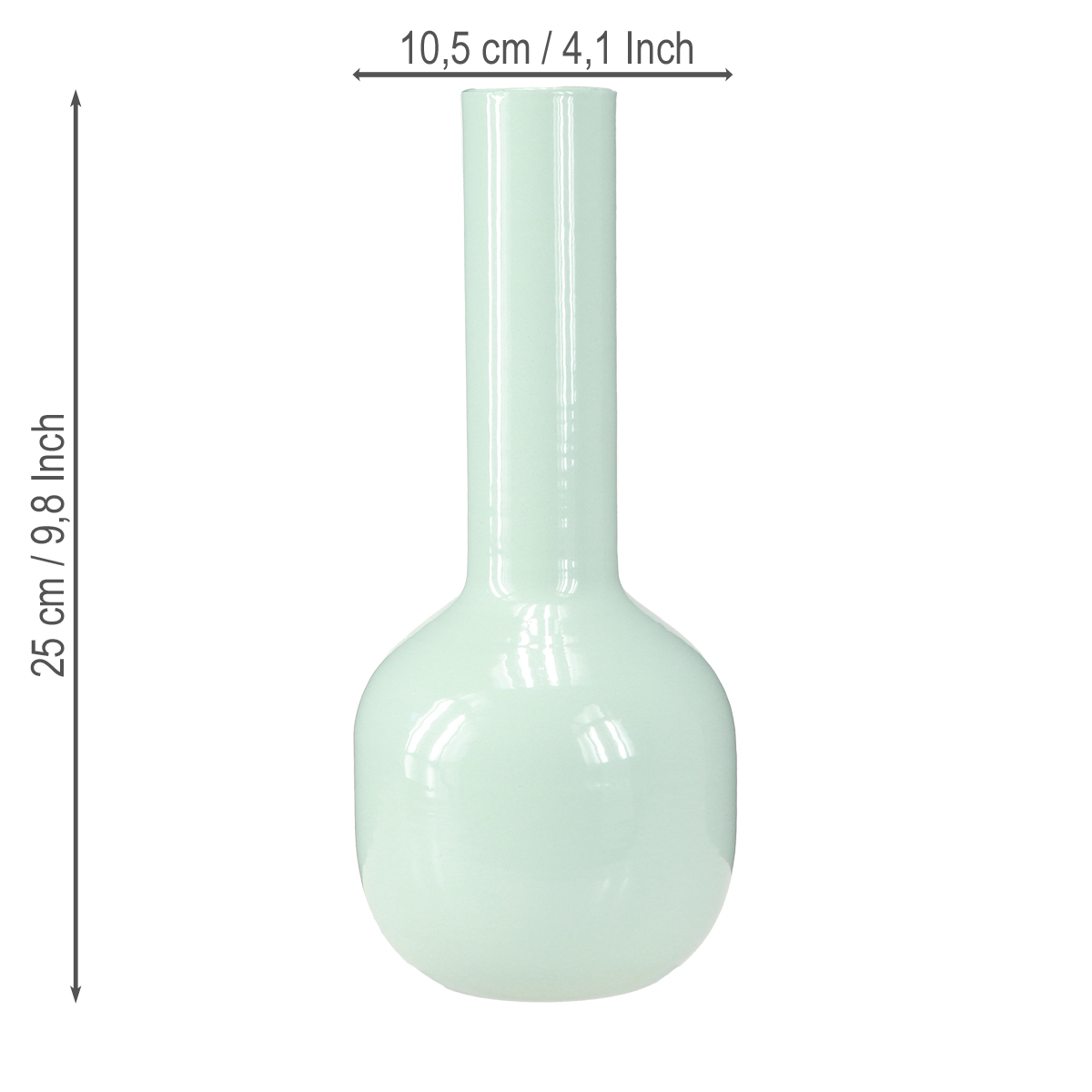 The metal vase with enamel in mint green is more than just a container for flowers - it is a stylish home accessory that gives any room a fresh aura. Its long, narrow neck and bulbous base give it a modern appearance. The light mint green makes it particularly attractive for spring and summer decorations. With a height of around 25.5 cm and a diameter of around 10.5 cm, this vase fits harmoniously into many interior design styles, from modern to Scandinavian to classic. The mint green enamel coating provides a color that radiates freshness and harmony, ideal for a pleasant and friendly living atmosphere. Combine the vase with other green decorative elements or use it as an eye-catcher. Either way, the metal vase in enamel design is a real highlight.