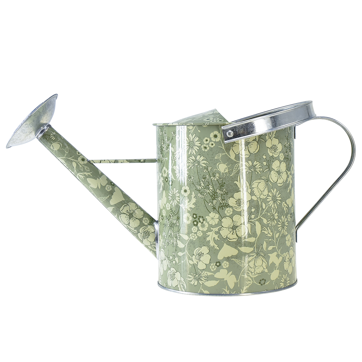 The pretty watering can also has a wide spout, a handle and a movable handle. These are also silver, like the inside of the can. The combination of the green floral pattern and the silver elements give the watering can decoration a charming vintage look.