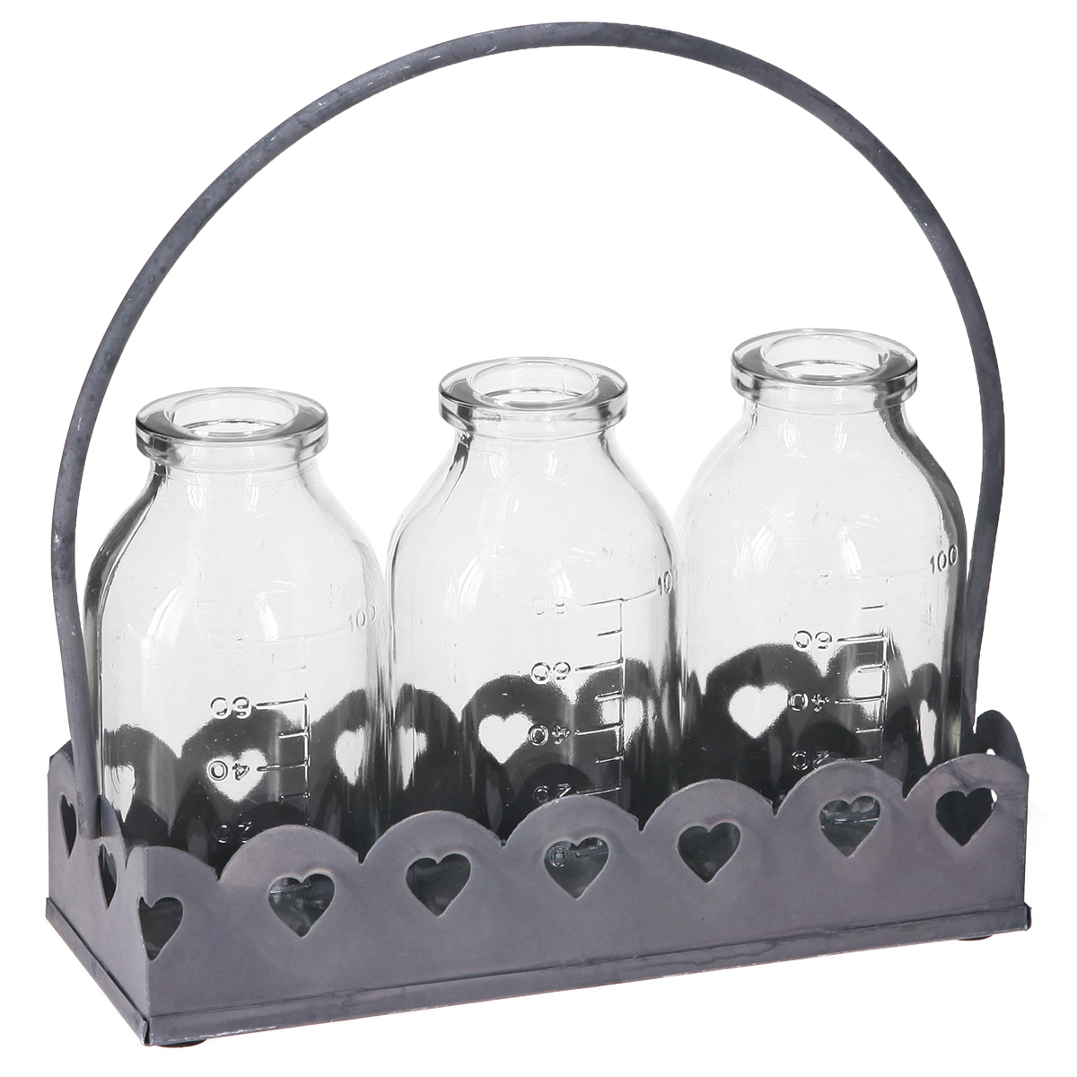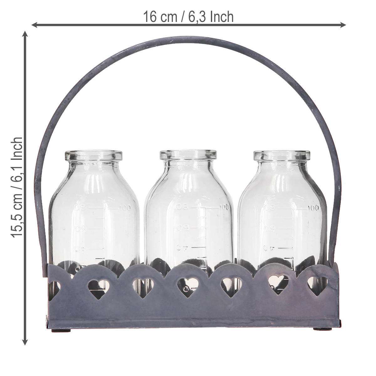 Experience the magical appeal of mini bottle decorations as vases on a tray. These charming decorative bottles are perfect for adding a touch of nostalgia to your living space. Each of the three glass vases is reminiscent of antique apothecary bottles and is placed on a sturdy, gray metal tray with punched-out heart motifs. This retro-style detail adds a romantic touch to the arrangement, making it ideal for wedding decor, cozy table settings, or as a gift idea. The dimensions of the bottles allow for a variety of uses, from quickly planting small floral arrangements to storing herbs or craft materials.