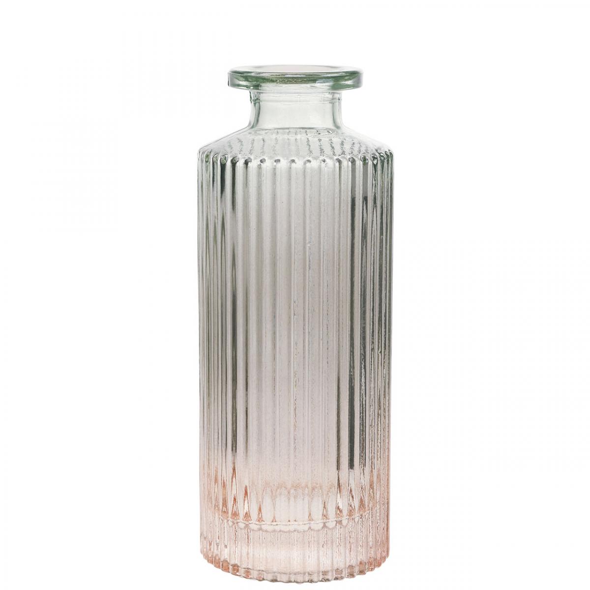 This decorative bottle is presented as a mini glass vase. The glass decoration has a lamellar relief and therefore fits in perfectly with a retro-style ambience.In addition to the rough feel, the color gradient exudes retro charm. It shows up slightly on the bottom of the decorative bottle as a brown tint, which slowly dissolves on the slim body of the mini vase.