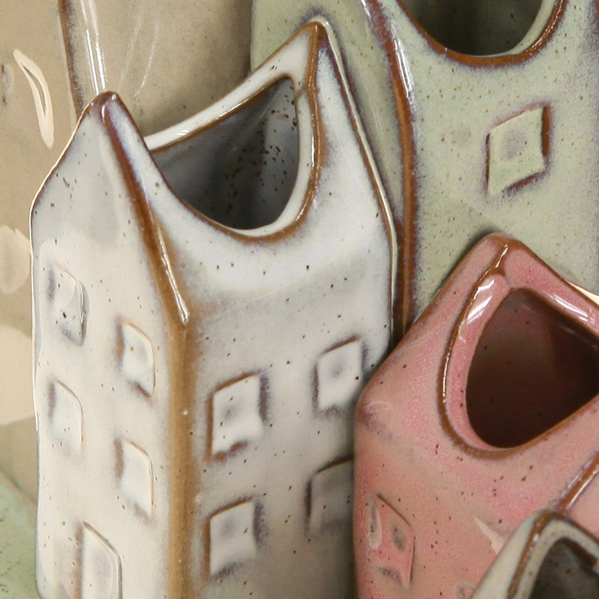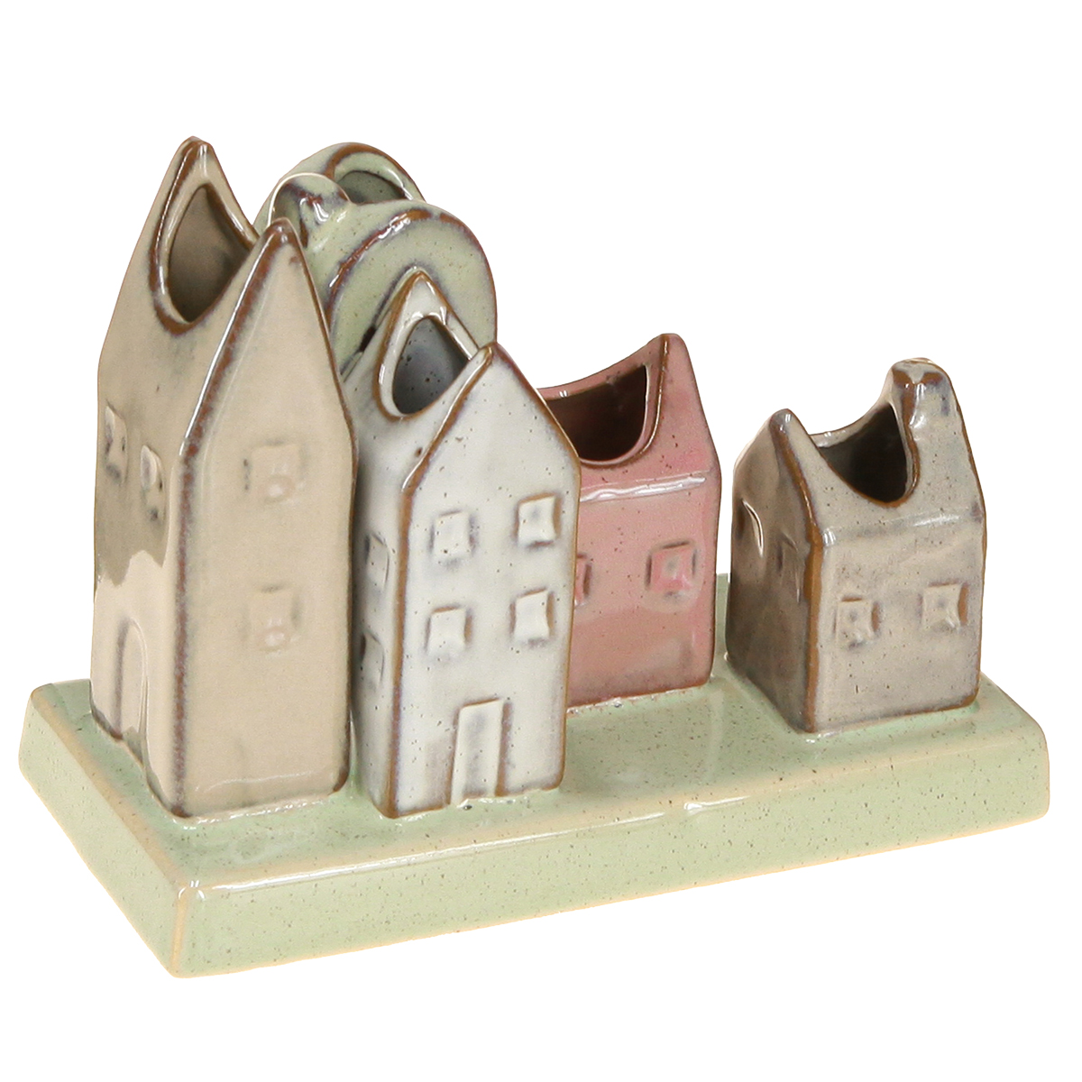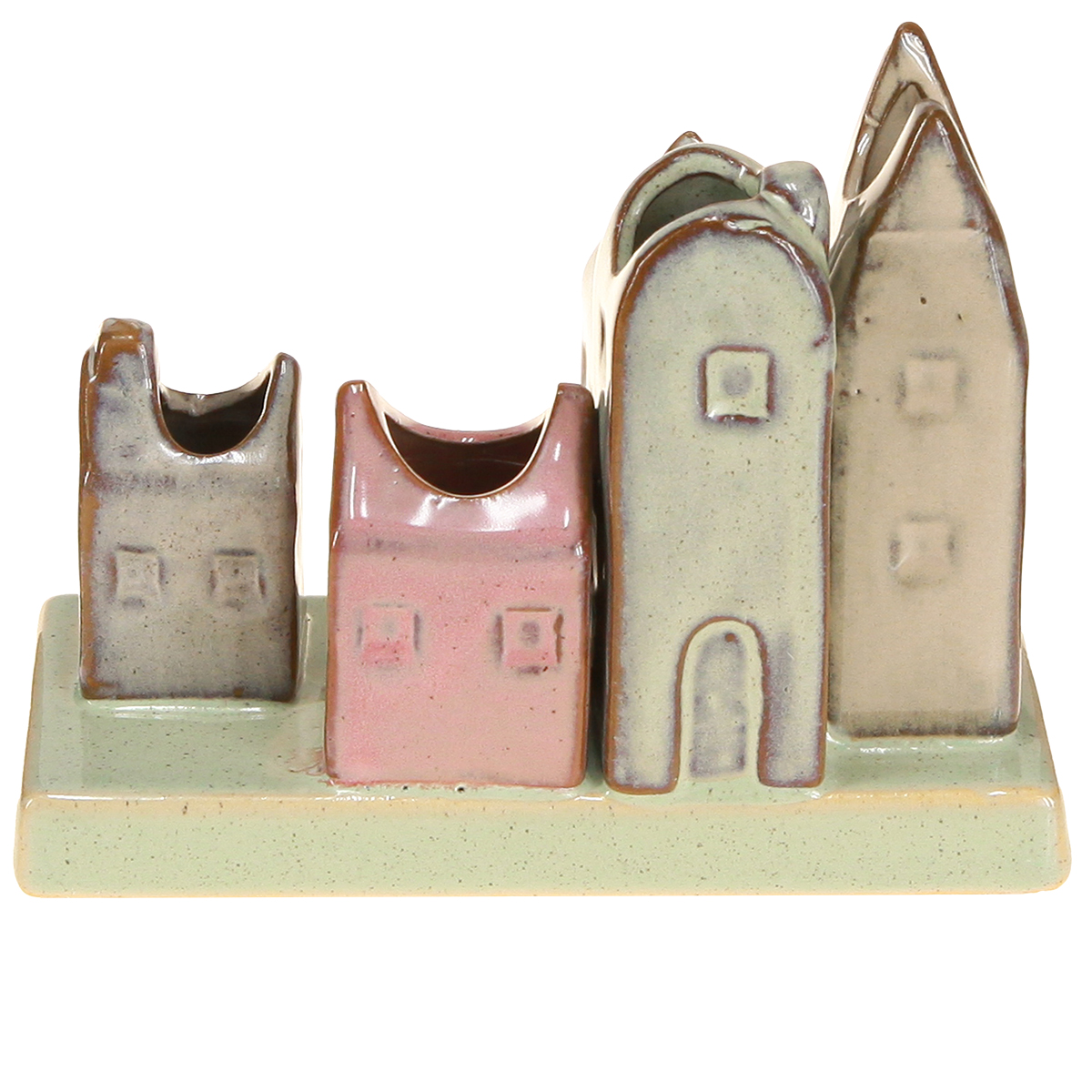 This handcrafted set of five miniature house-shaped vases is more than just a decoration – it's a lovingly designed combination of art and functionality. Measuring 14 cm long, 7 cm wide, and 11 cm high, the set is the perfect size to be displayed effectively even on small tables. The delicate, warm colors – soft green, pink, and gray – ensure that the mini vases blend seamlessly into almost any interior design style, from Scandinavian modern to country chic.