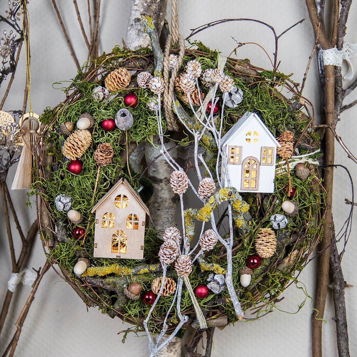 If you hang a chain of lights on the tree, the mirror berries will start to sparkle. Make sure to use this fact for a window decoration that also uses a chain of lights, because you can attach the berries with the flexible wire there too. But you can also work the small Christmas balls into an Advent wreath and even wrap them on the branches of your large indoor plants.
