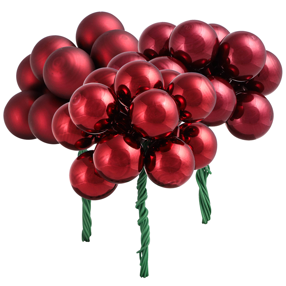 The burgundy and red mirror berries in matt and glossy finish are attached to green craft wire and grouped together in several bunches. They are delivered in a box with a total of around 140 pieces and each has a diameter of around 20 millimeters.