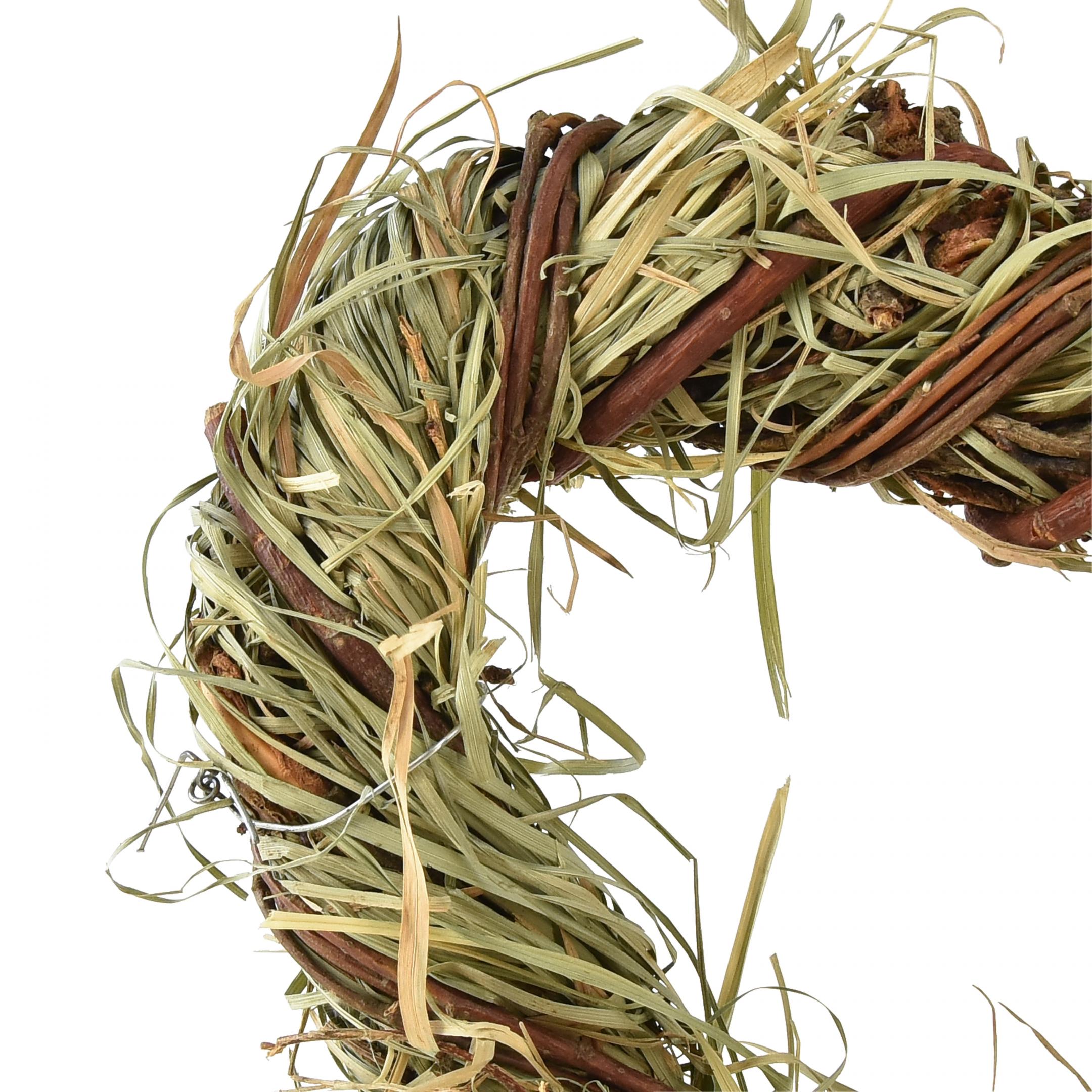 The wreath is made of vine branches and blades of grass that have been twisted together to form a ring. This creates a wavy pattern on the edge, alternating between brown and green.