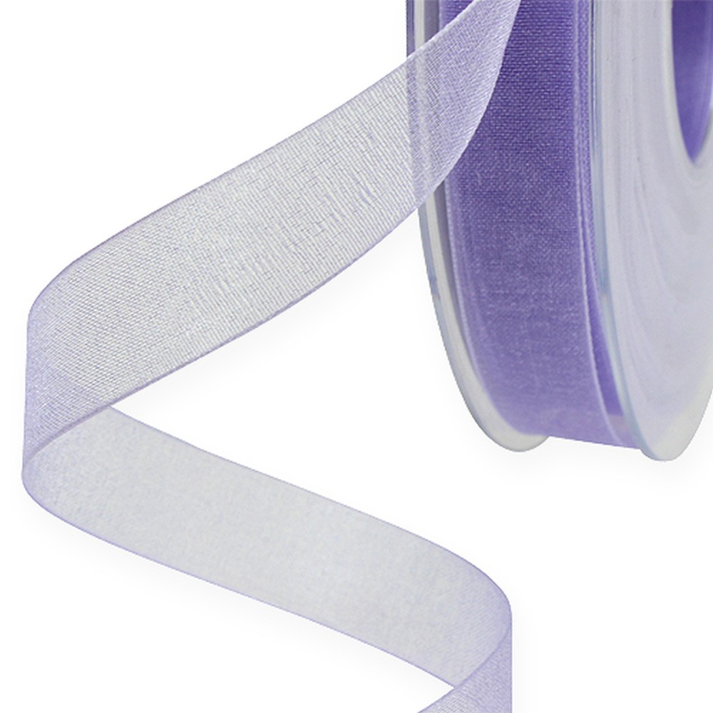 The organza ribbon with selvedge in light purple is around 50 meters wound on a plastic roll that can also be put on a standard dispenser. The width is about 15 millimeters.
