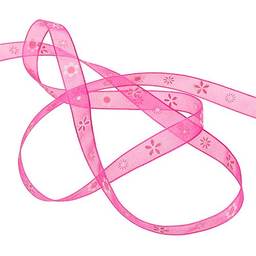 The pink organza ribbon with a pattern of flowers is wound on a plastic roll and is around 20 meters long and around 10 millimeters wide.