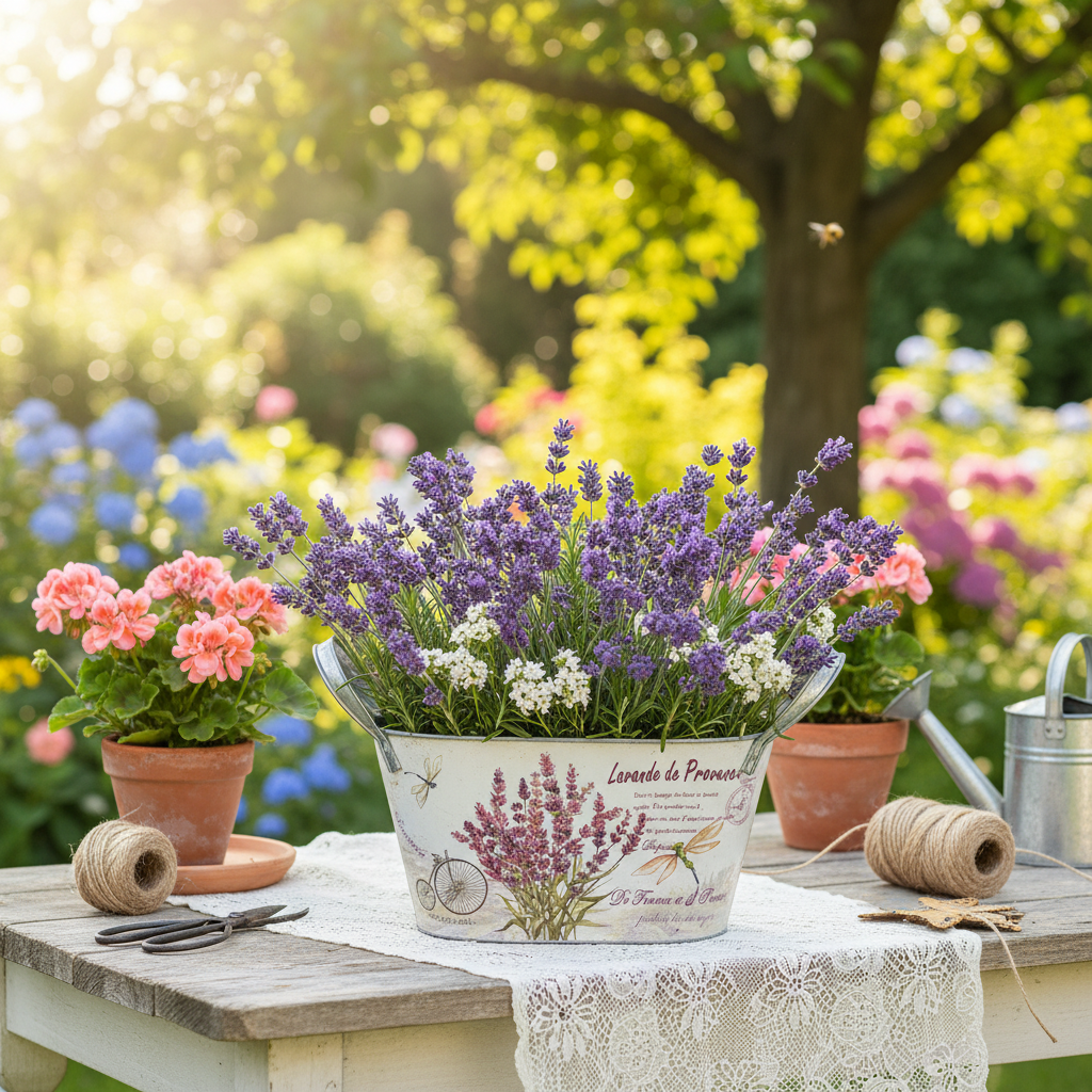 Create a summery arrangement with lavender in the flower bowl or cover the pot with foil so that you can plant the metal decoration.