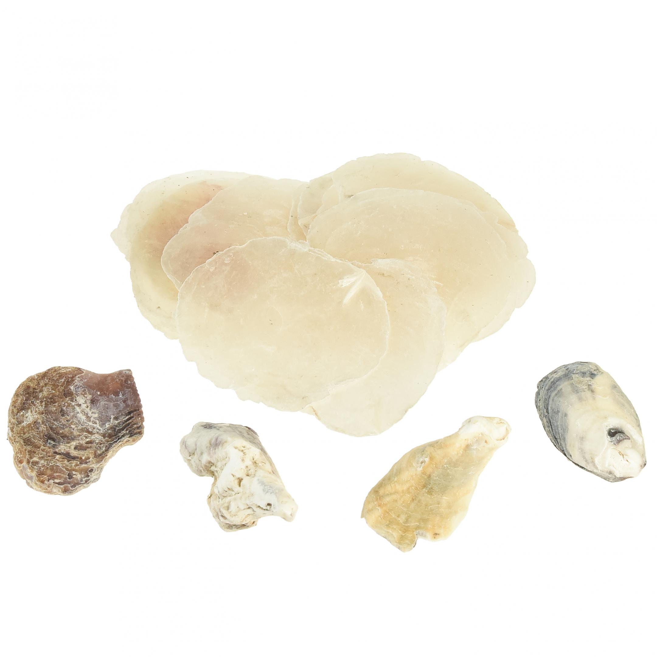 You will receive the capiz slices and oysters each as a net with a net weight of around 250 grams. The net contains many individual mother-of-pearl shells measuring 6.5 to 9.5 centimeters and oyster shells measuring 3.5 to 9 centimeters long.