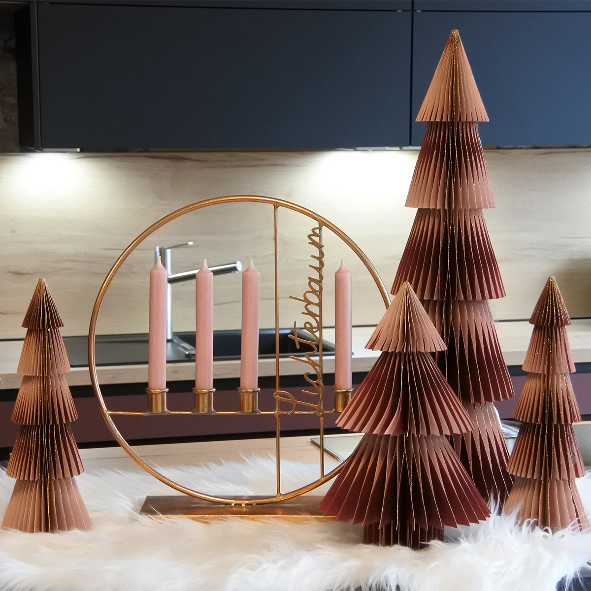 Accentuate the Christmas tree with other trees of different sizes and colors or under a Christmas branch with honeycomb balls. The paper Christmas tree also looks very festive as the center of a decorative bowl with fir greenery and cones.