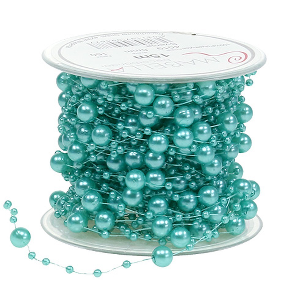The pearl ribbon in turquoise is wound on a plastic spool and has a length of about 15 meters. The pearls are either about 3 millimeters or about 6 millimeters in diameter.