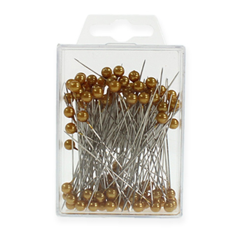 The pearl head needles in gold are delivered in a practical hanging box with 100 copies each. A needle is about 65 millimeters long; the pearl has a diameter of about 6 millimeters.