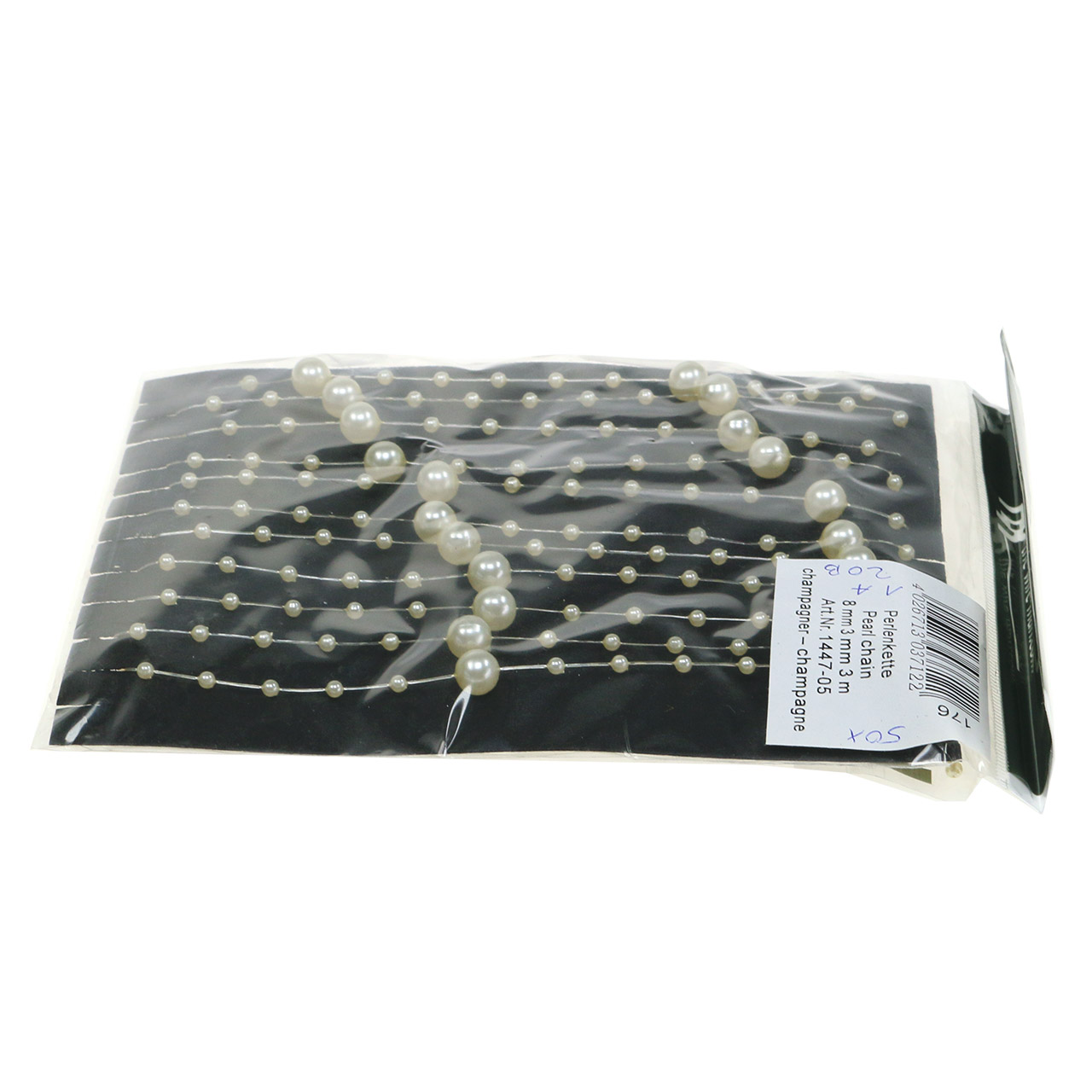 The pearl necklace in champagne is made of plastic and has a total length of about 3 meters. It contains small pearls about 3 millimeters in diameter and large pearls about 8 millimeters in diameter.