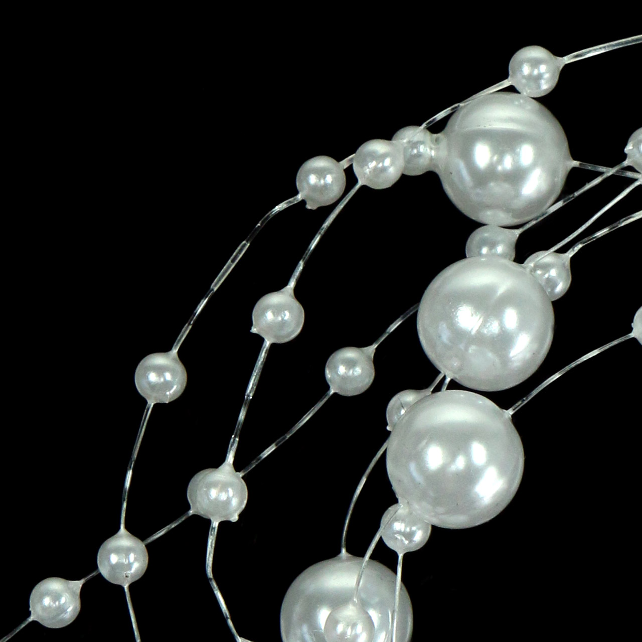 The pearl necklace in white is made of plastic and has a total length of about 3 meters. It contains small pearls about 3 millimeters in diameter and large pearls about 8 millimeters in diameter.
