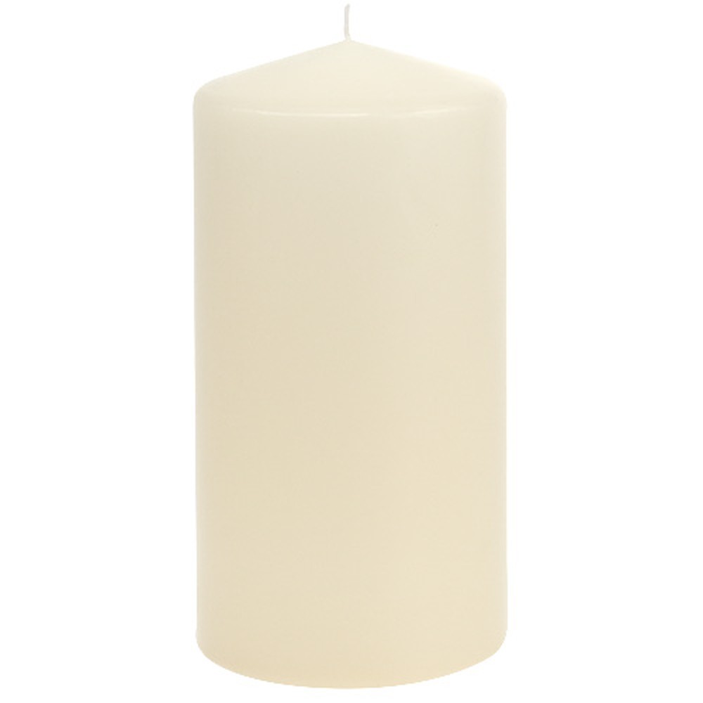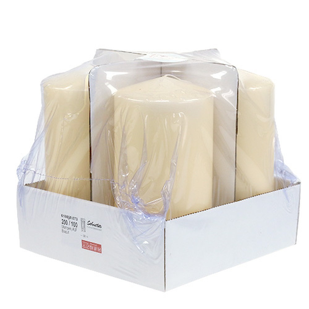 The large and wide pillar candle in cream is delivered as a set of 4 in a box. Each wax candle has a height of about 200 millimeters and a diameter of about 100 millimeters. The burn time is about 128 hours.