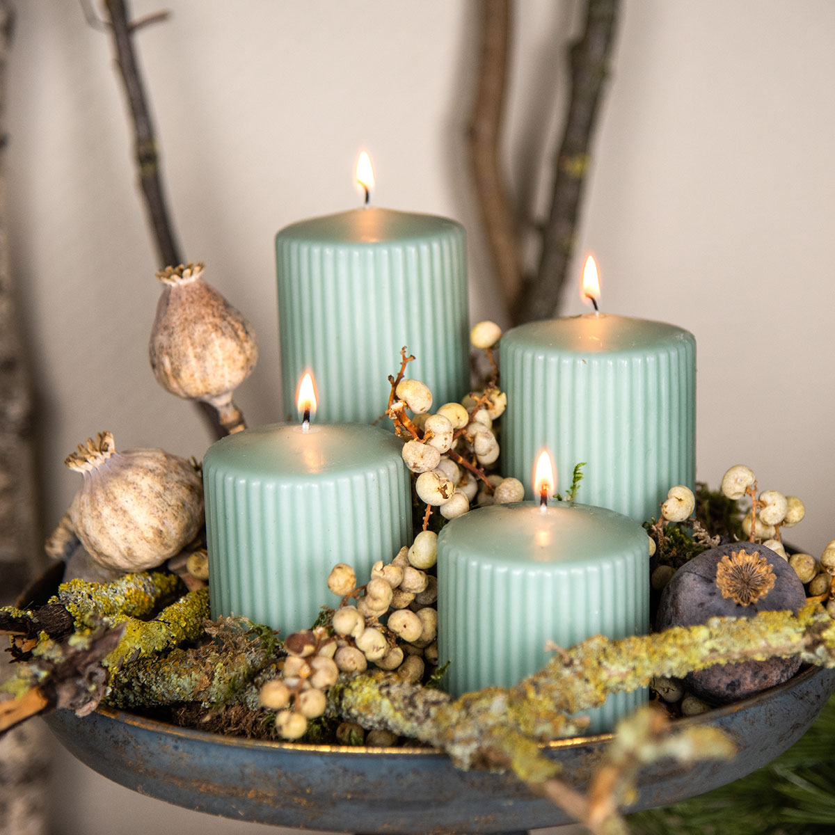 The cool emerald green harmonizes with many original decoration ideas. Whether you combine the grooved candles with white, gold, light blue or black accessories, these pillar candles always radiate elegance.