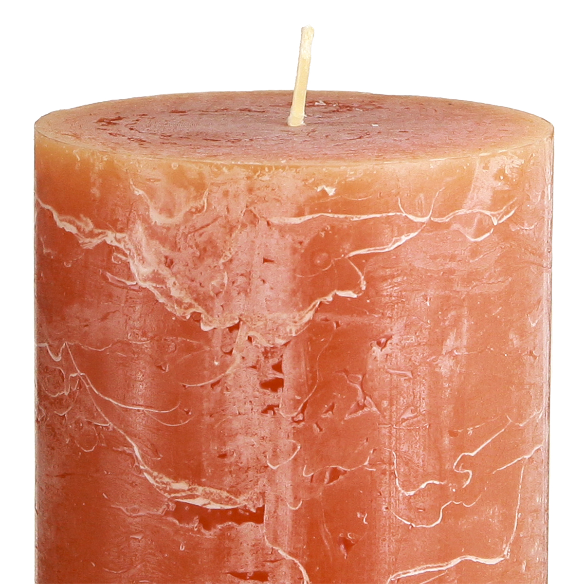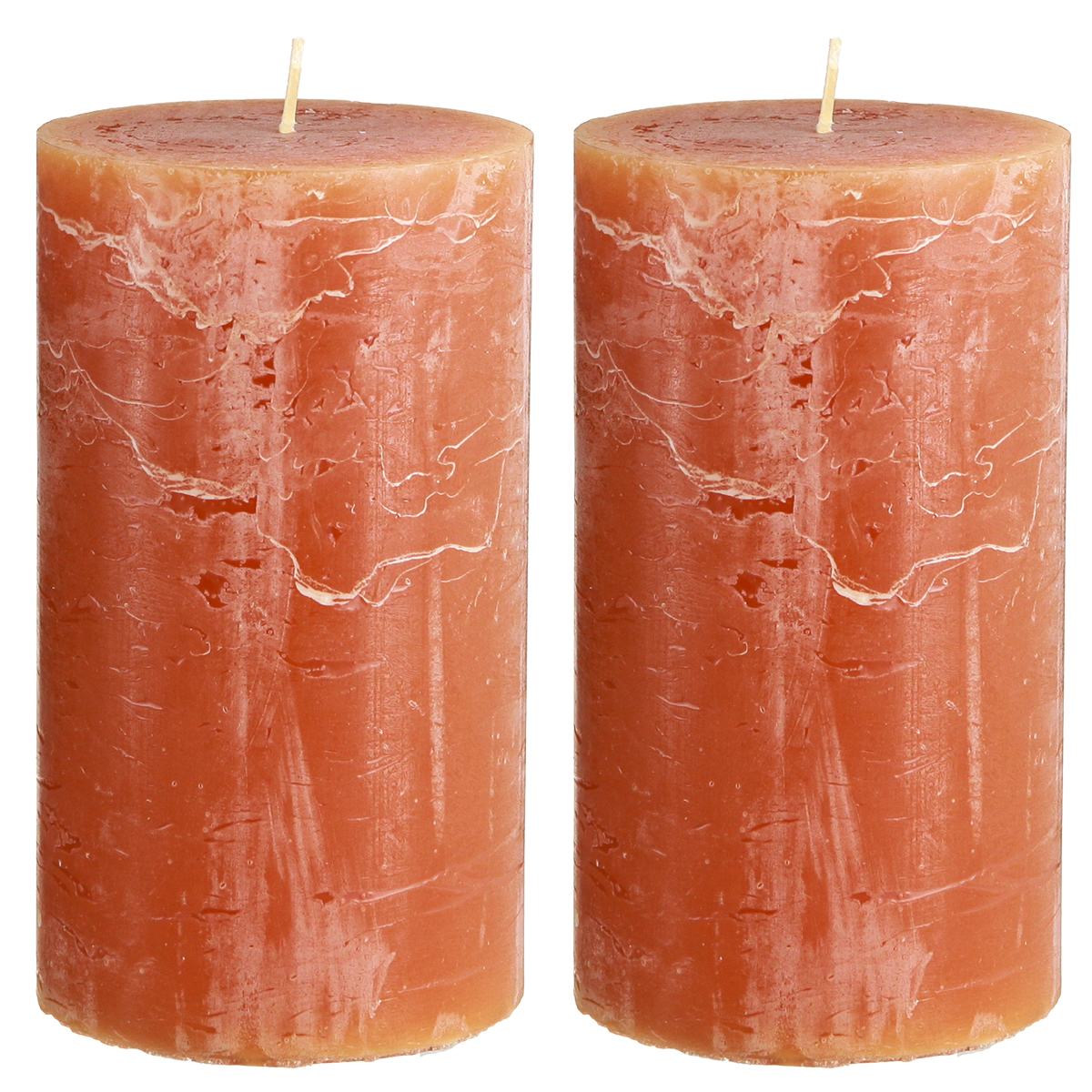 - Solid-coloured pillar candles in dark orange with subtle colour transitions on the edges