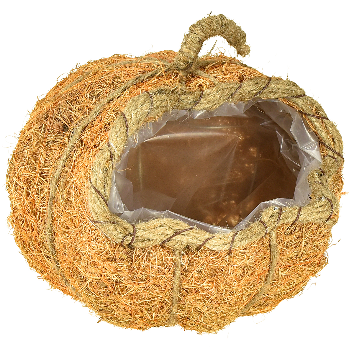 This foil-lined planter basket is the perfect accessory to take your fall decor to the next level. Featuring vibrant orange tamarind fiber on a sturdy metal frame, this planter basket will bring warmth and color to your home. The planting opening is elegantly framed with jute, and the stem can serve not only as a decorative element but also as a practical hook for transforming the pumpkin into a charming hanging basket for hanging plants. Whether on the living room table as an autumnal arrangement or as an inviting decoration in front of the front door, this planter basket is versatile. The foil-lined interior allows you to stylishly arrange and display real or artificial flowers, plants, or other decorative elements.