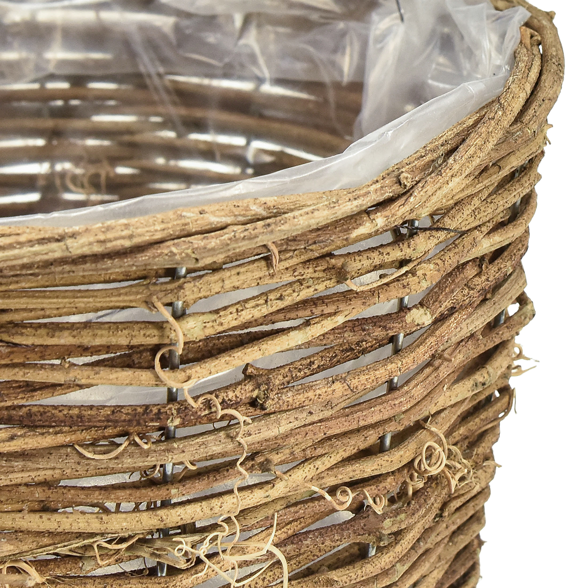 The natural plant basket impresses with its high-quality workmanship. The vines are carefully woven around a stable metal base, making each basket unique. The clear film is securely attached to the metal with dark brown thread, so you can plant your flowers and herbs without worry.