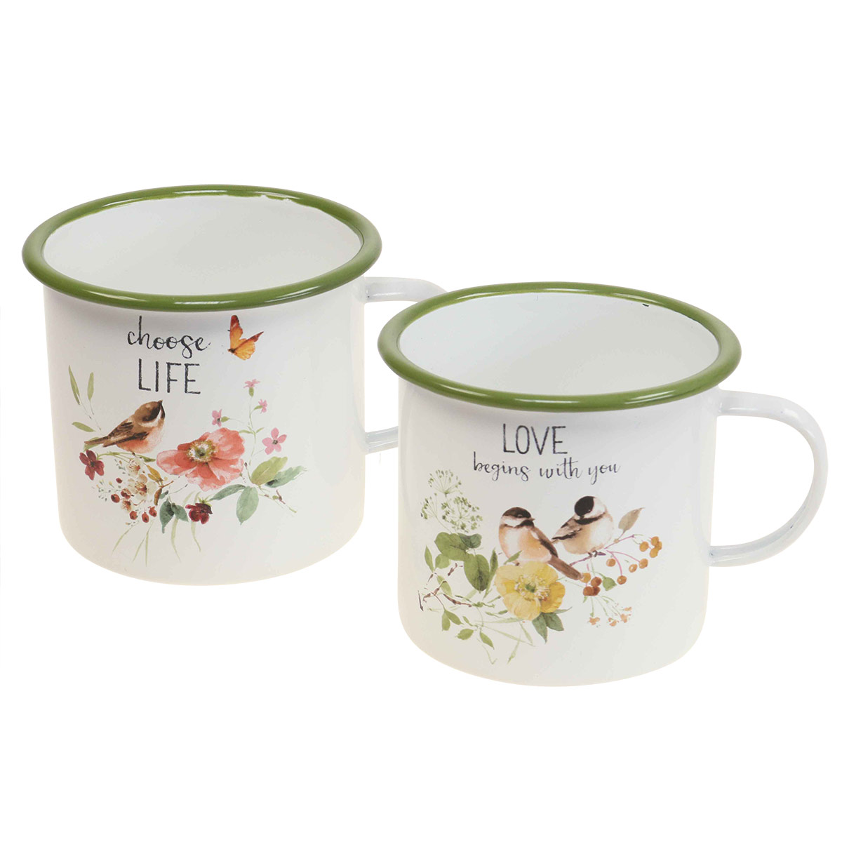 The decorative mug is enamelled, colored white and provided with a green border. The cup is available with one of the two life-wise sayings "Choose Life" or "Love begins with you".
