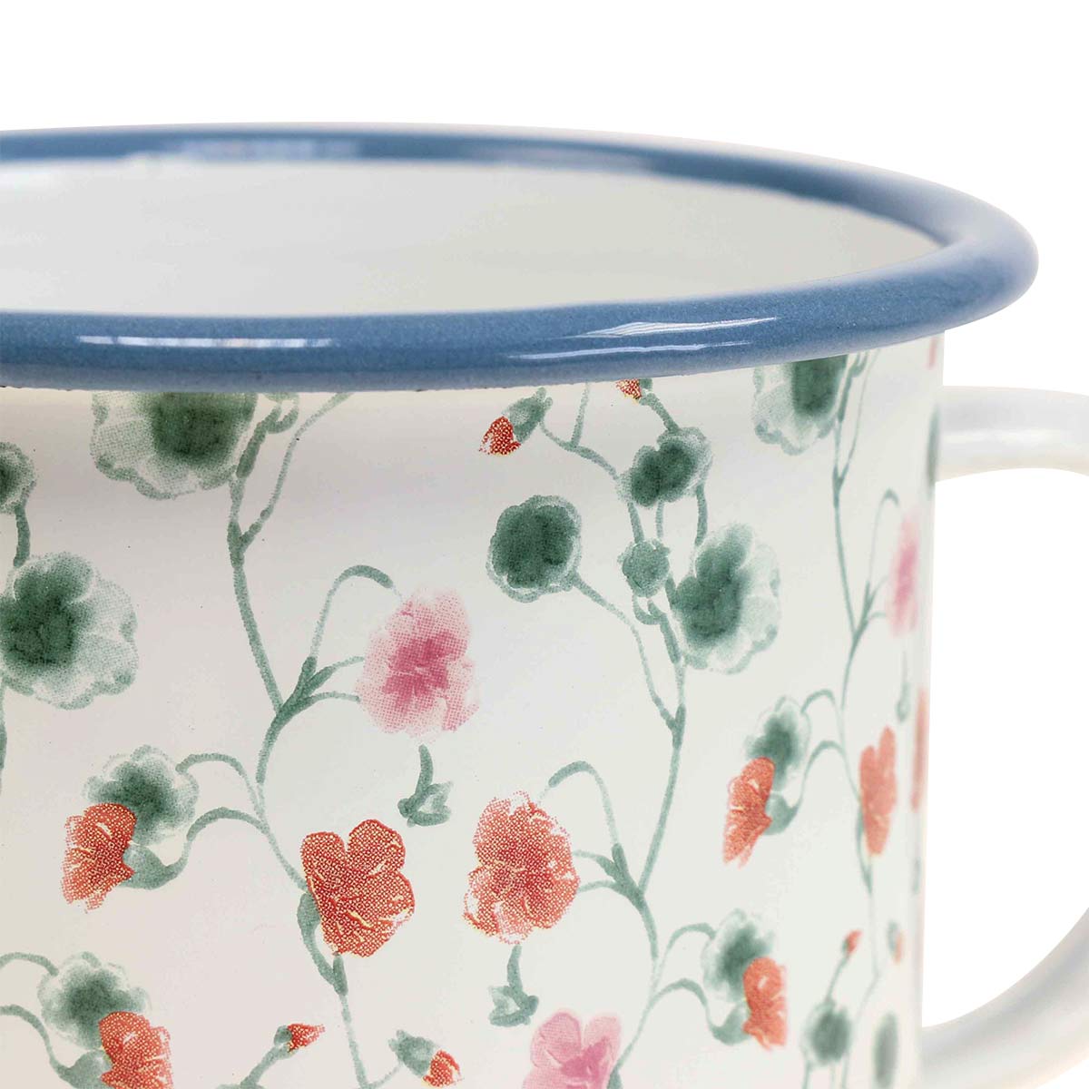The white decorative mug has a blue edge and a blue splash of paint on the handle. The cup is decorated all around with a pattern of green flower stalks and red and pink flowers.