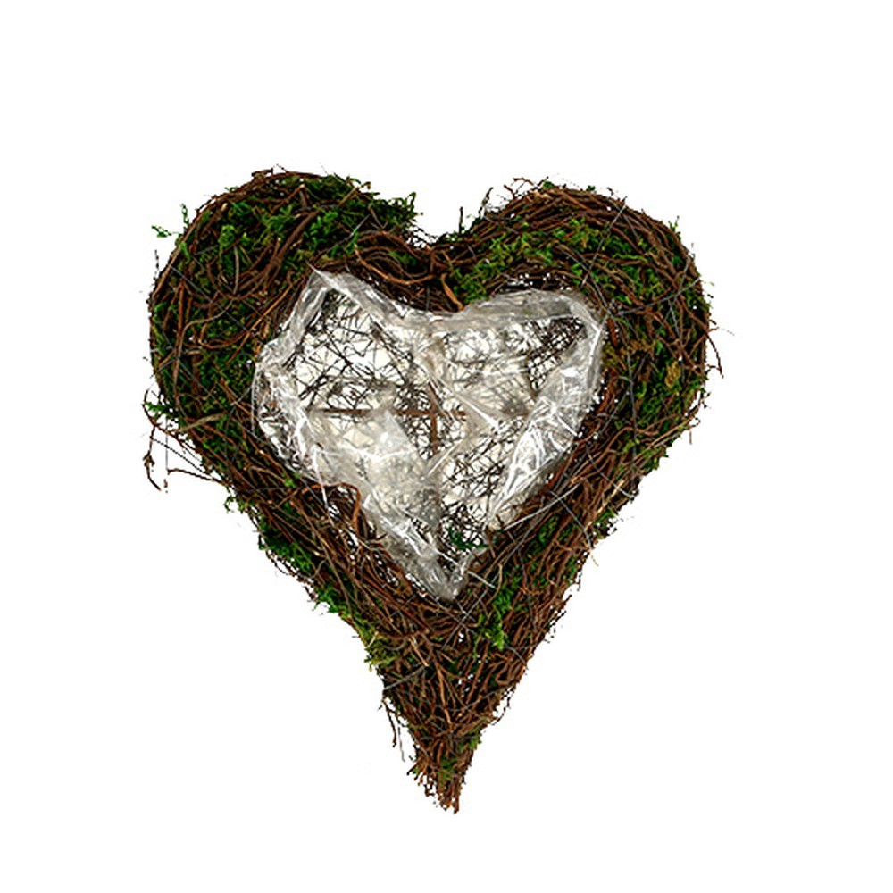 The plant heart with brown vine and green moss has the outer dimensions of 22 x 25 x 7 centimeters and can even be hung with a hook as a wall decoration. The planting area inside has the dimensions of approximately 12 x 11 x 5.5 centimeters.