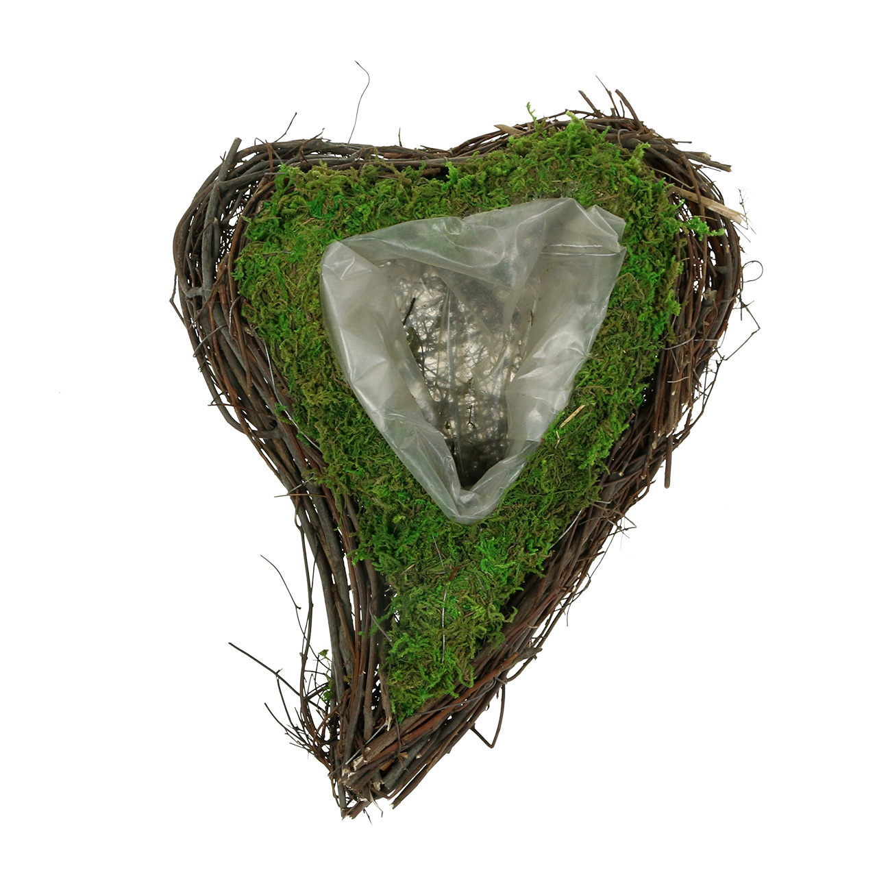Create a natural grave design with this distinctive plant heart. The decorative heart consists of a basic structure of vine and willow branches and is accompanied by a moss heart lying on it. A plastic film inside the decorative heart allows you to plant it practically.