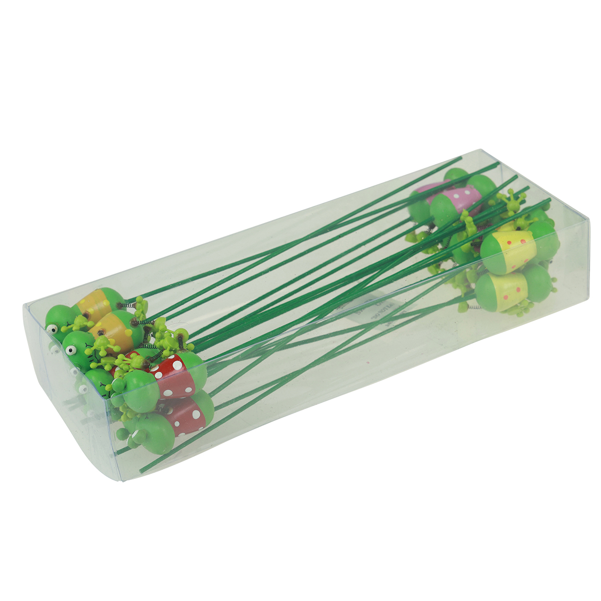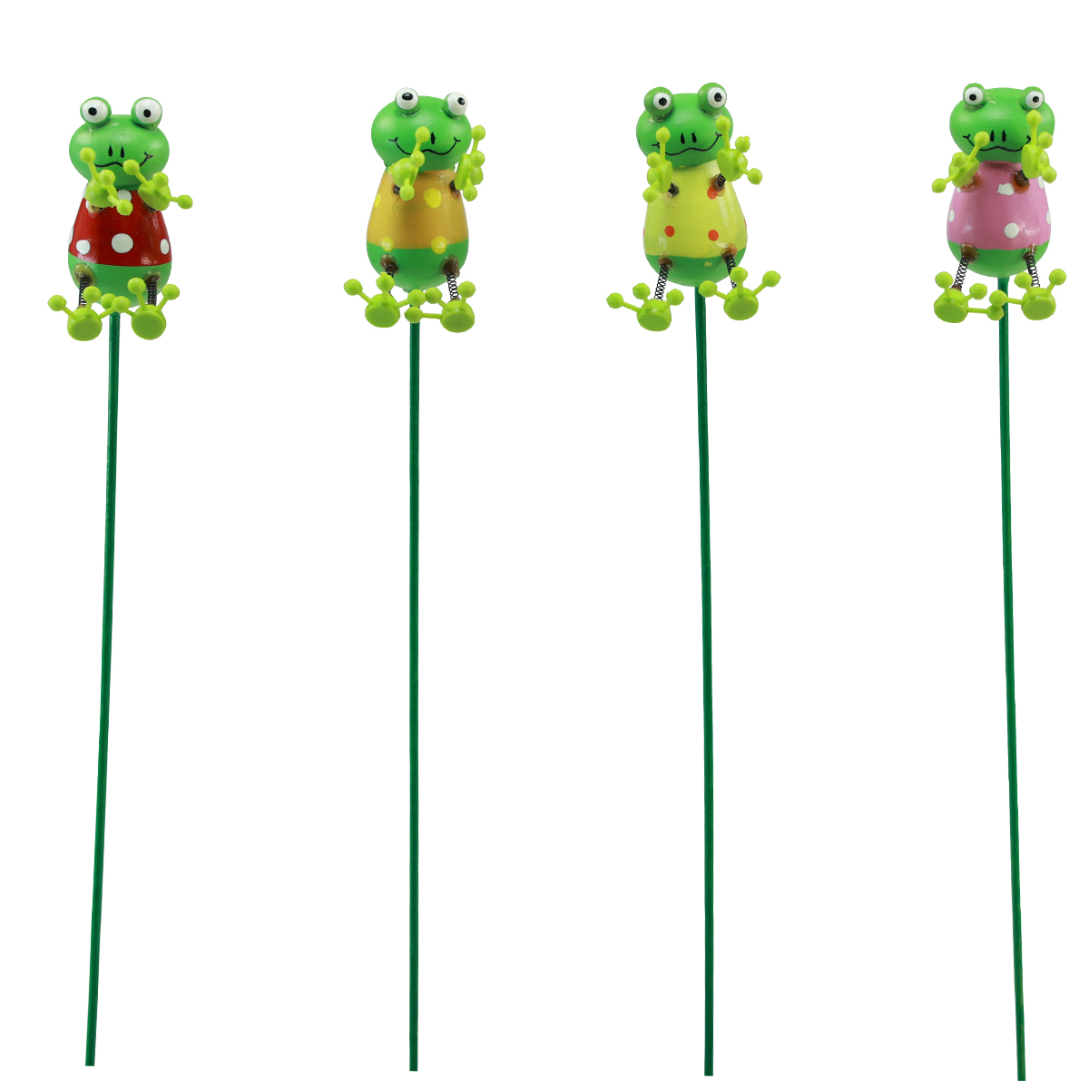 The frogs for sticking come in a pack of 16, sorted in four different colors. The set includes four decorative frogs on the stick in each color variation.