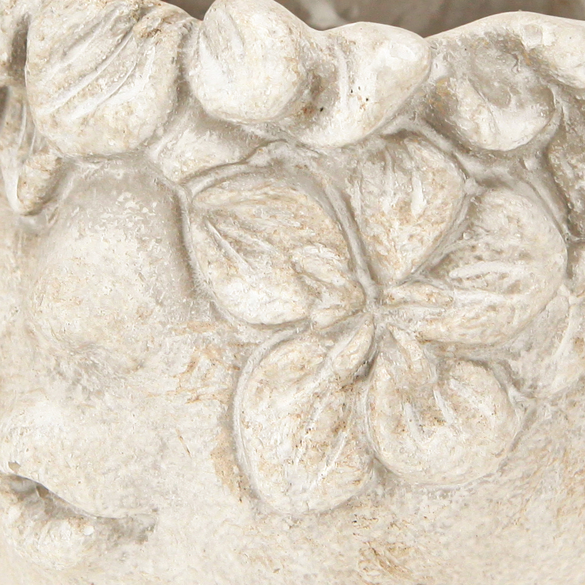 This delightful planter resembles a funny bust. Only the neck, the pouty mouth, and the tip of the nose are visible, as a wreath of flowers obscures the eyes. If you're looking for an original flowerpot with a face, don't think twice. The whitewashed concrete surface gives the planter a very vintage feel, with typical discoloration that comes with time. However, the look of the planter also fits well with a modern interior design style.An ideal planter for all your houseplants, such as geraniums, spider plants, or azaleas. It creates a truly beautiful effect when plants and flowers grow from one head. Even without contents, the planter head makes a charming decorative bust for adorning windowsills, shelves, or dressers. The base of the planter is covered with round foam protectors to prevent scratches on your delicate furniture.