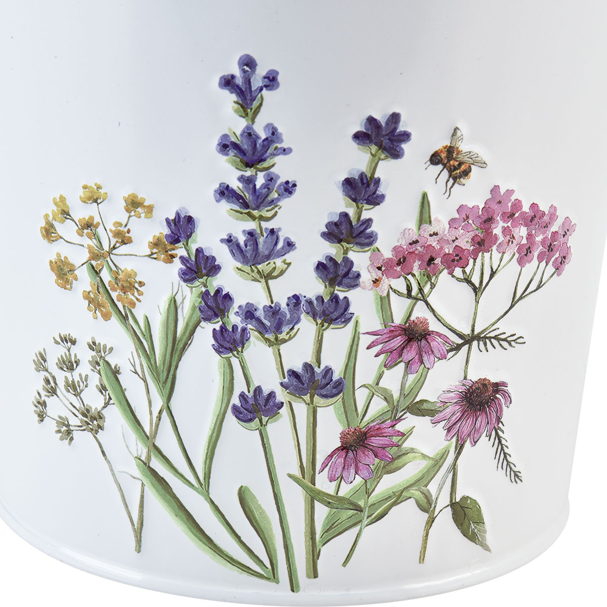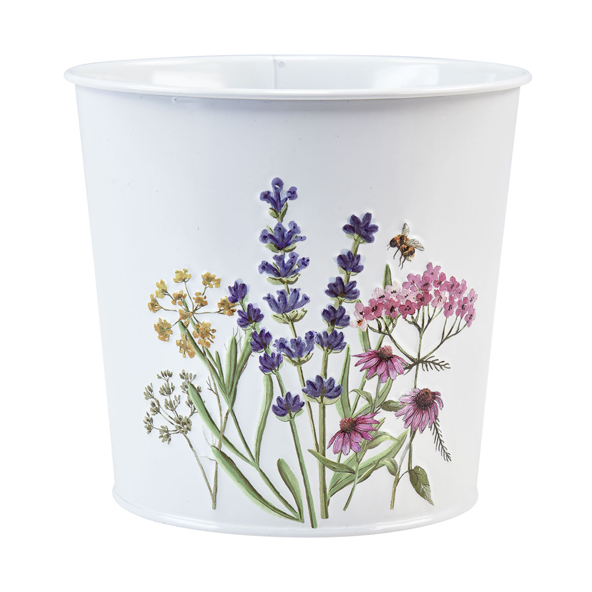 This beautiful metal flower pot is perfect as a plant pot for your spring or summer decorations! The simple white metal planter is decorated on one side with an embossed motif of wild herbs with a bee, colored in natural colors.