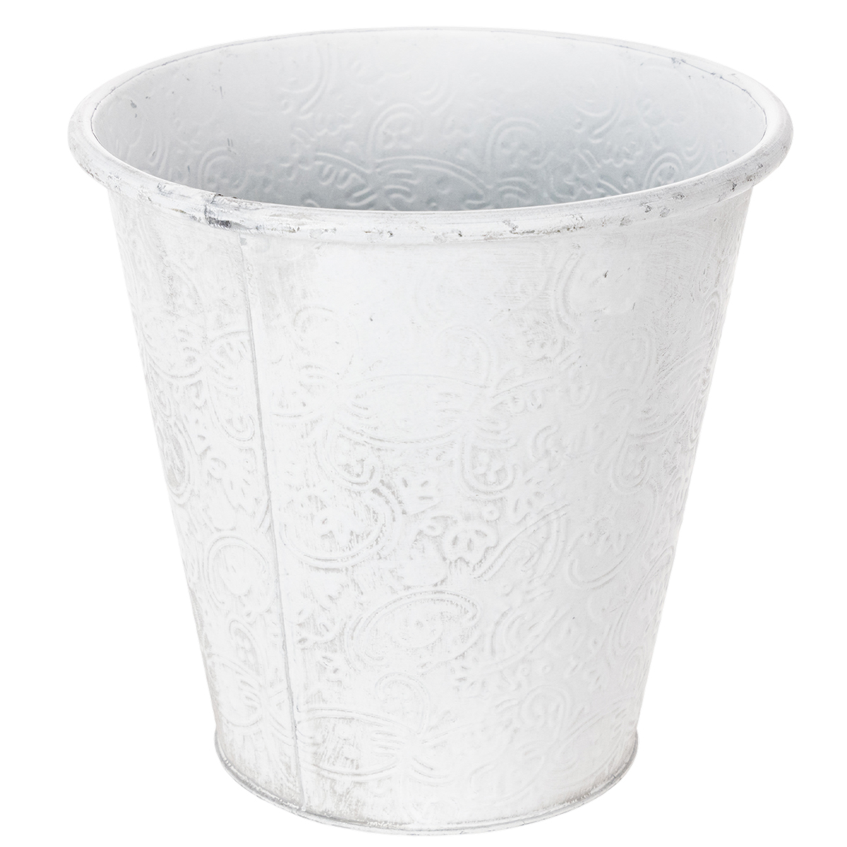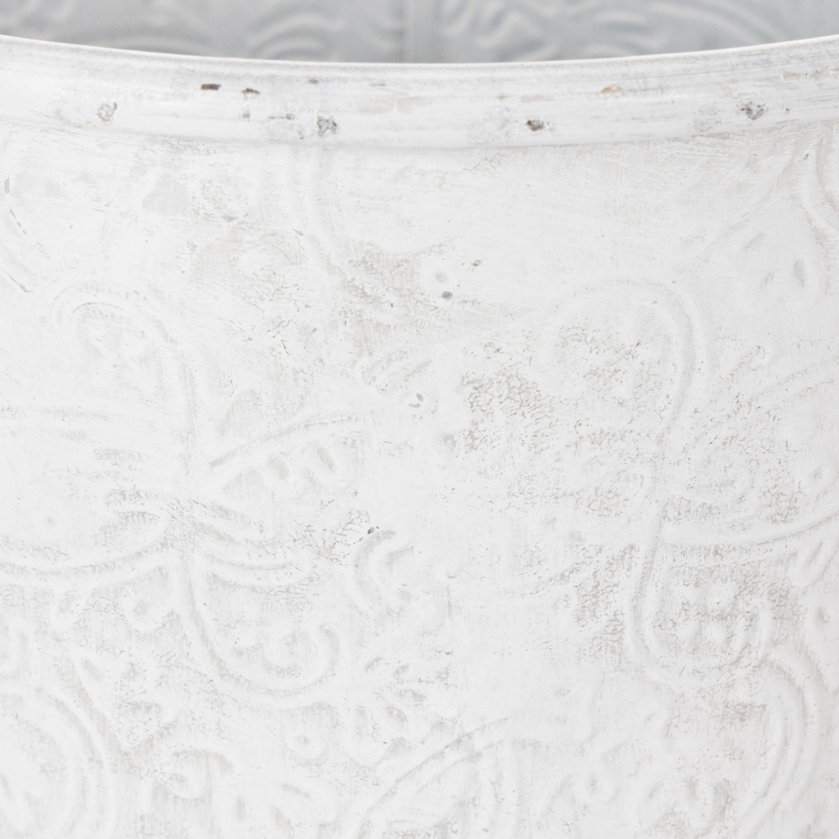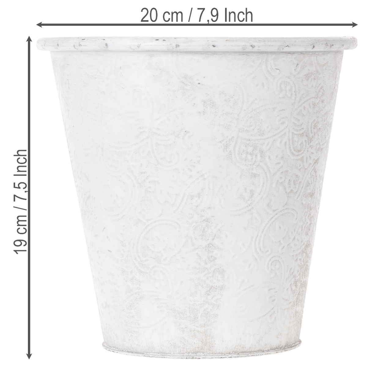 The fairytale-like cachepot is decorated with ornaments: The metal decoration is embossed with floral flowers all around. With its romantic look and the white wash in trendy shabby chic, the metal vessel also fits wonderfully as a table decoration in vintage style for a flower decoration for a wedding!