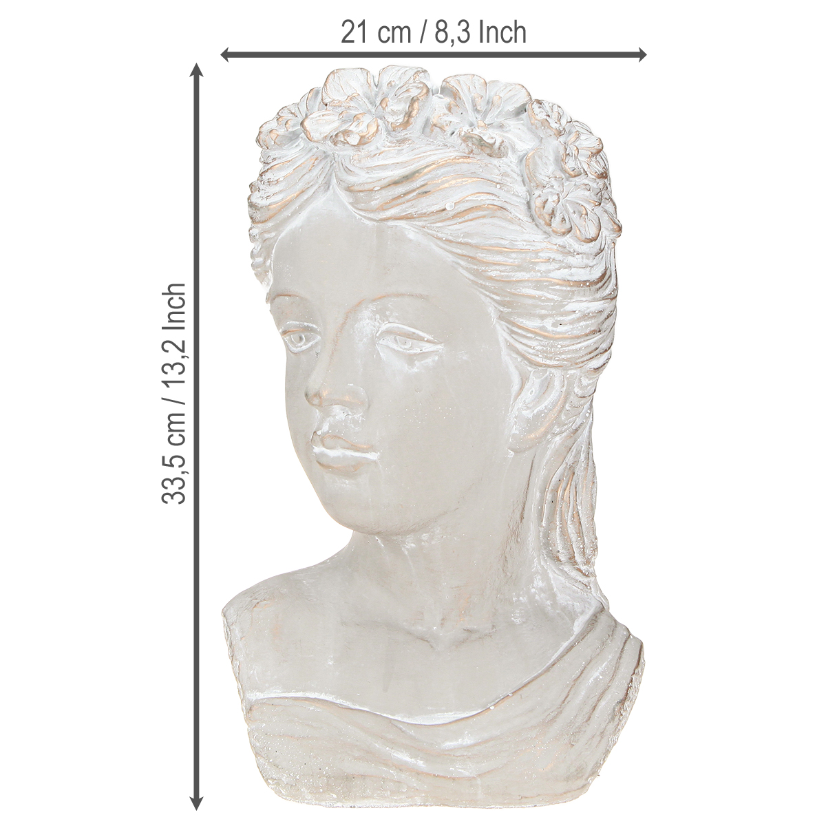 The planter is a cast stone sculpture of a woman with an antique look and is the perfect focal point for any room. Measuring approximately 21 x 17.5 x 33.5 cm, it combines elegant aesthetics and functional utility in a unique decorative object. The detailed elaboration of the facial features and hair, reminiscent of classical sculptures, gives this planter a special touch. The woman's head, adorned with a floral wreath, brings an antique flair to your home. The graceful shape and robust craftsmanship make the bust a long-lasting accessory for your garden or interior. The planter blends beautifully with various interior styles, be it country house, classic, or shabby chic. The combination of white and gold accents on a gray background creates a harmonious overall picture. Perfect for decorators, DIY enthusiasts, and anyone who appreciates something special.