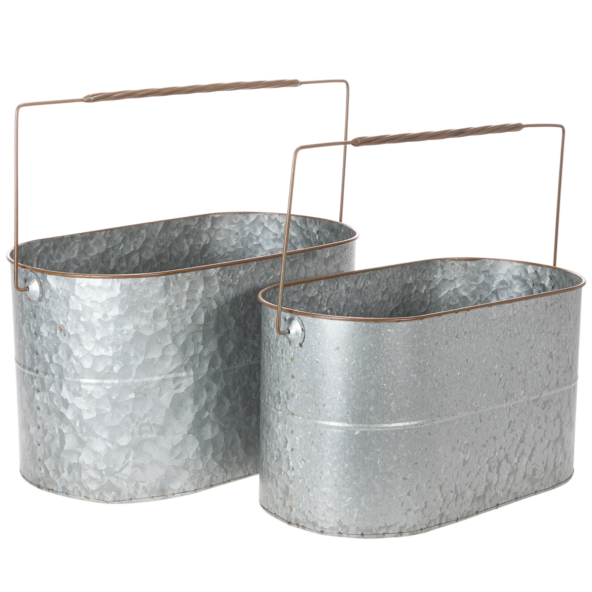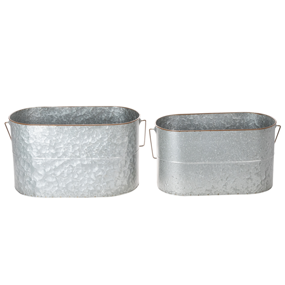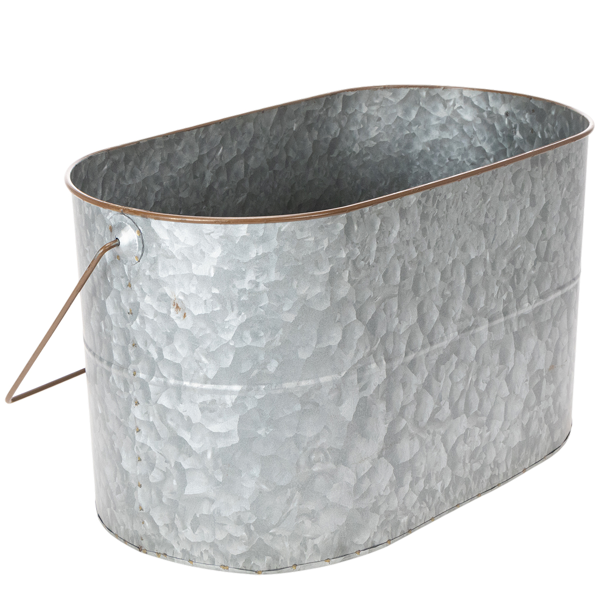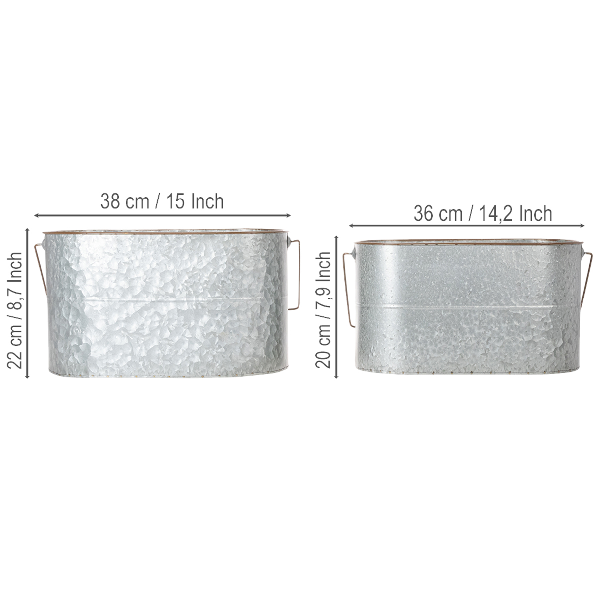 The plant bowls with handles are high-quality metal pots that can be used for many occasions. The elongated metal buckets in silver with a brown edge are really great as a planter or cachepot!