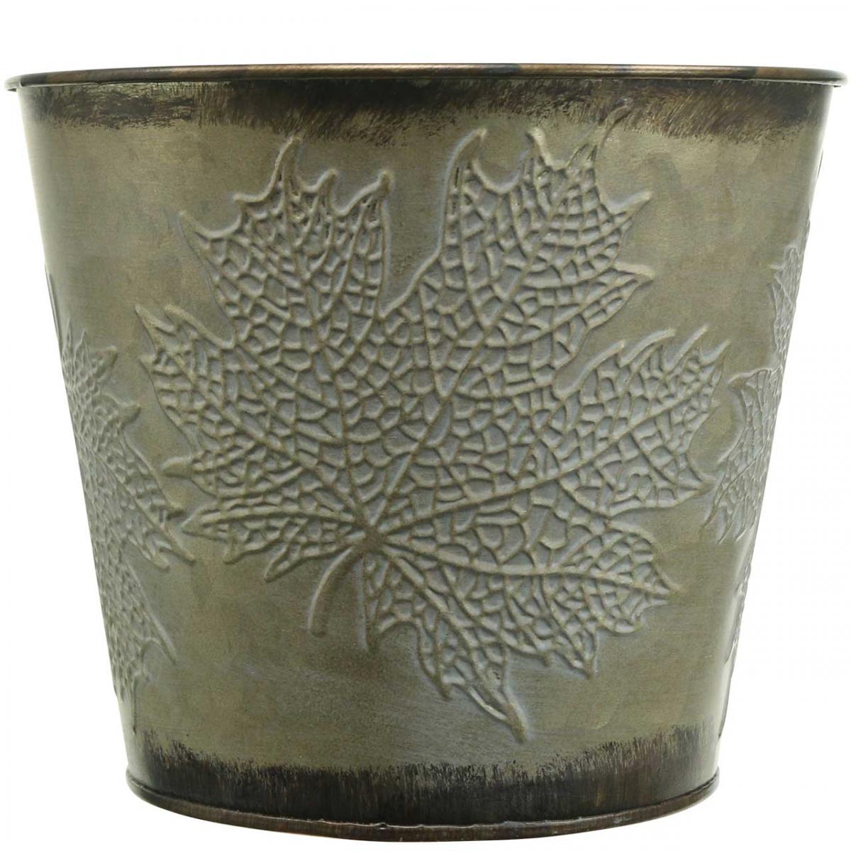 Product name: Planter for autumn, metal bucket with leaf decoration, golden metal vessel Ø14cm H12.5cm