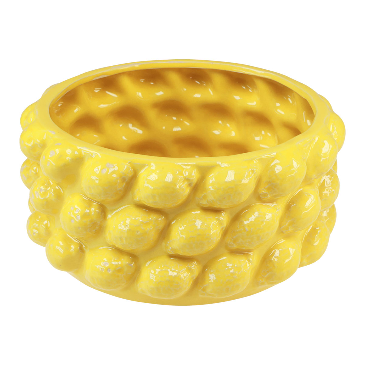 Glazed in a vibrant yellow, this special ceramic bowl is inspired by the bright colors of Mediterranean citrus fruits. The sculptural design of the outside with many small lemons gives the planter an attractive and lively appearance.